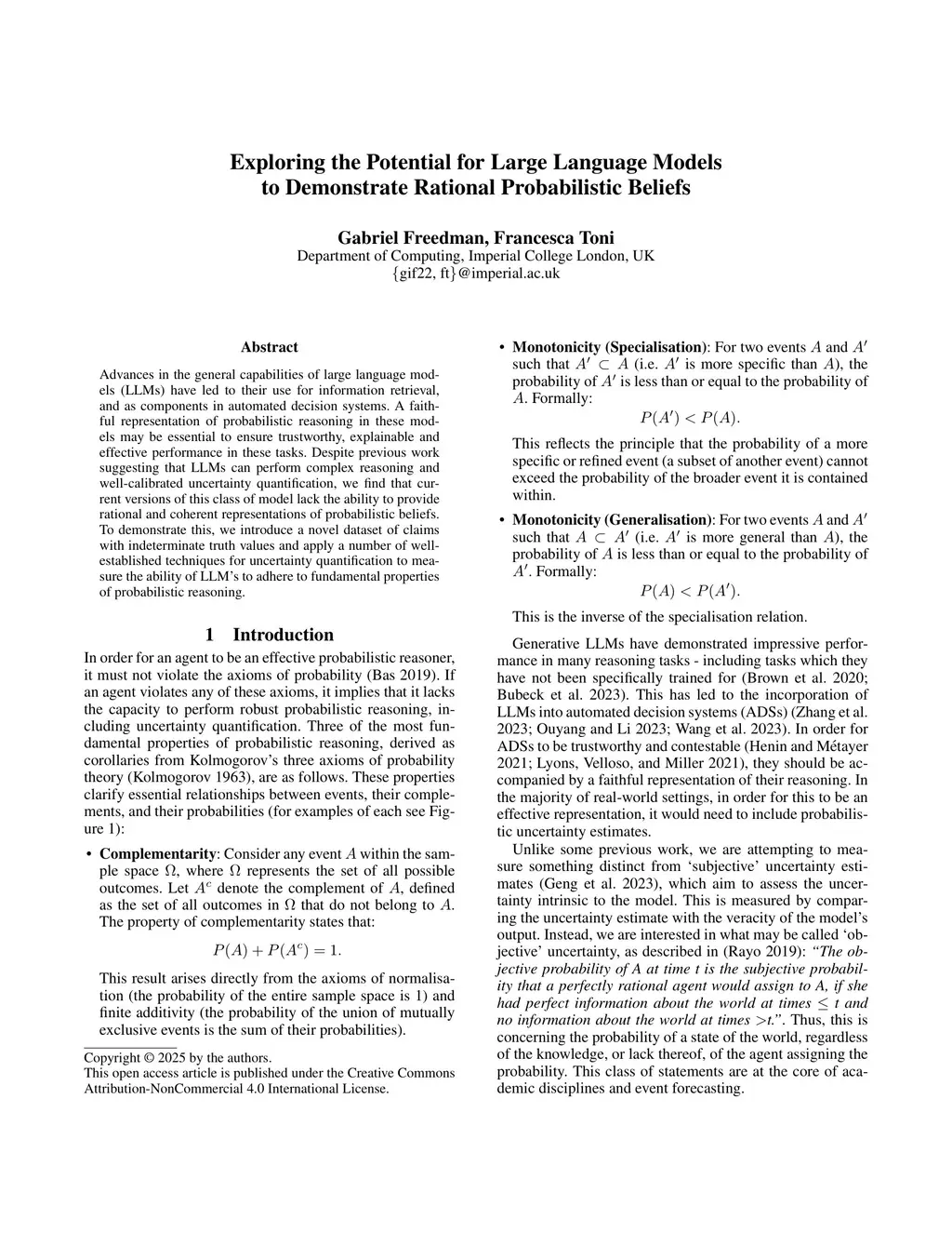 Advances in the general capabilities of large language models (LLMs) have led to their use for information retrieval, and as components in automated decision systems. A faithful representation of probabilistic reasoning in these models may be essential to ensure trustworthy, explainable and effective performance in these tasks. Despite previous work suggesting that LLMs can perform complex reasoning and well-calibrated uncertainty quantification, we find that current versions of this class of model lack the ability to provide rational and coherent representations of probabilistic beliefs. To demonstrate this, we introduce a novel dataset of claims with indeterminate truth values and apply a number of well-established techniques for uncertainty quantification to measure the ability of LLM's to adhere to fundamental properties of probabilistic reasoning.