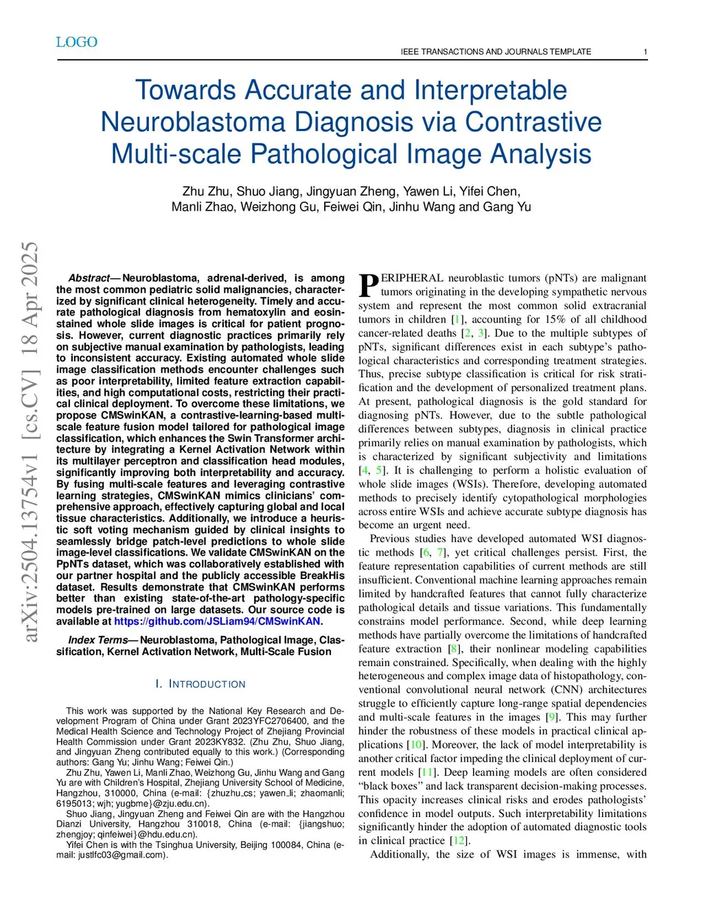 Neuroblastoma, adrenal-derived, is among the most common pediatric solid malignancies, characterized by significant clinical heterogeneity. Timely and accurate pathological diagnosis from hematoxylin and eosin-stained whole-slide images is critical for patient prognosis. However, current diagnostic practices primarily rely on subjective manual examination by pathologists, leading to inconsistent accuracy. Existing automated whole-slide image classification methods encounter challenges such as poor interpretability, limited feature extraction capabilities, and high computational costs, restricting their practical clinical deployment. To overcome these limitations, we propose CMSwinKAN, a contrastive-learning-based multi-scale feature fusion model tailored for pathological image classification, which enhances the Swin Transformer architecture by integrating a Kernel Activation Network within its multilayer perceptron and classification head modules, significantly improving both interpretability and accuracy. By fusing multi-scale features and leveraging contrastive learning strategies, CMSwinKAN mimics clinicians' comprehensive approach, effectively capturing global and local tissue characteristics. Additionally, we introduce a heuristic soft voting mechanism guided by clinical insights to bridge patch-level predictions to whole-slide image-level classifications seamlessly. We verified the CMSwinKAN on the publicly available BreakHis dataset and the PpNTs dataset, which was established by our hospital. Results demonstrate that CMSwinKAN performs better than existing state-of-the-art pathology-specific models pre-trained on large datasets. Our source code is available atthis https URL.
