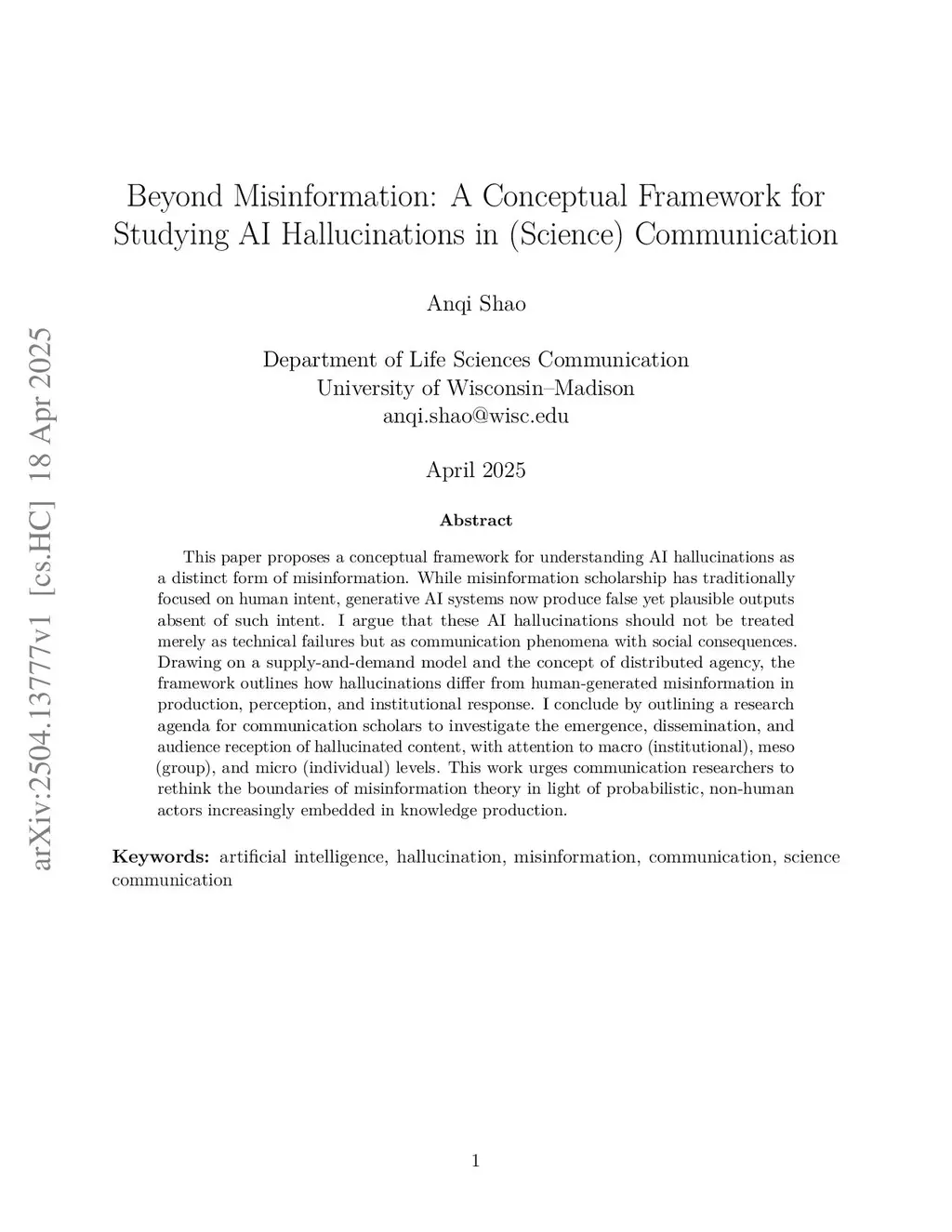 This paper proposes a conceptual framework for understanding AI hallucinations as a distinct form of misinformation. While misinformation scholarship has traditionally focused on human intent, generative AI systems now produce false yet plausible outputs absent of such intent. I argue that these AI hallucinations should not be treated merely as technical failures but as communication phenomena with social consequences. Drawing on a supply-and-demand model and the concept of distributed agency, the framework outlines how hallucinations differ from human-generated misinformation in production, perception, and institutional response. I conclude by outlining a research agenda for communication scholars to investigate the emergence, dissemination, and audience reception of hallucinated content, with attention to macro (institutional), meso (group), and micro (individual) levels. This work urges communication researchers to rethink the boundaries of misinformation theory in light of probabilistic, non-human actors increasingly embedded in knowledge production.