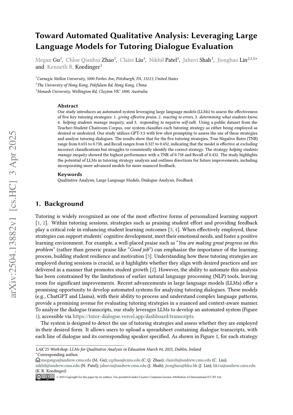 Our study introduces an automated system leveraging large language models (LLMs) to assess the effectiveness of five key tutoring strategies: 1. giving effective praise, 2. reacting to errors, 3. determining what students know, 4. helping students manage inequity, and 5. responding to negative self-talk. Using a public dataset from the Teacher-Student Chatroom Corpus, our system classifies each tutoring strategy as either being employed as desired or undesired. Our study utilizes GPT-3.5 with few-shot prompting to assess the use of these strategies and analyze tutoring dialogues. The results show that for the five tutoring strategies, True Negative Rates (TNR) range from 0.655 to 0.738, and Recall ranges from 0.327 to 0.432, indicating that the model is effective at excluding incorrect classifications but struggles to consistently identify the correct strategy. The strategy \textit{helping students manage inequity} showed the highest performance with a TNR of 0.738 and Recall of 0.432. The study highlights the potential of LLMs in tutoring strategy analysis and outlines directions for future improvements, including incorporating more advanced models for more nuanced feedback.