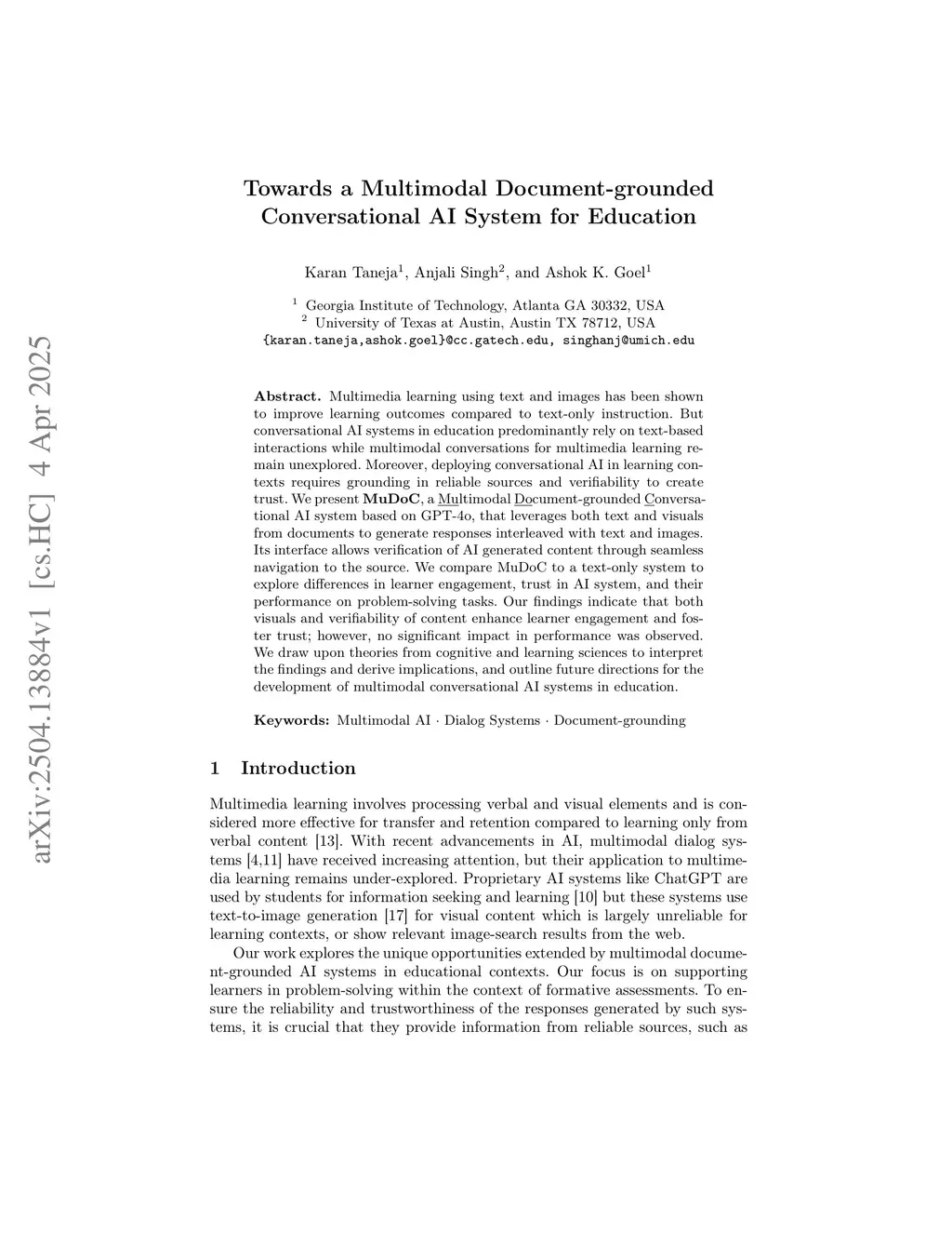 Towards a Multimodal Document-grounded Conversational AI System for Education