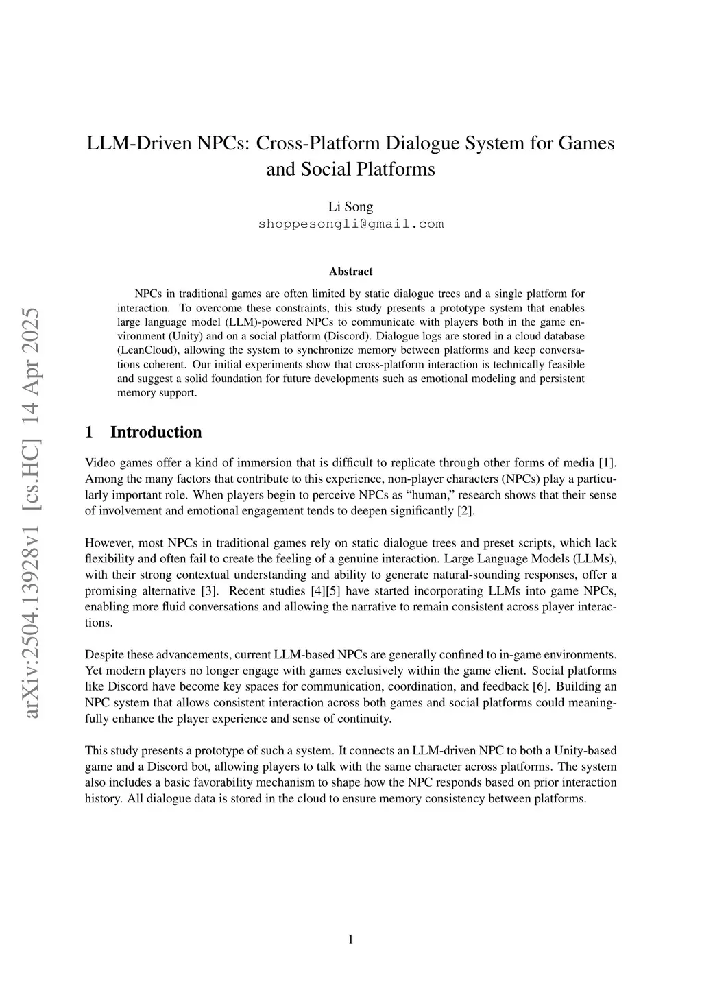 NPCs in traditional games are often limited by static dialogue trees and a single platform for interaction. To overcome these constraints, this study presents a prototype system that enables large language model (LLM)-powered NPCs to communicate with players both in the game en vironment (Unity) and on a social platform (Discord). Dialogue logs are stored in a cloud database (LeanCloud), allowing the system to synchronize memory between platforms and keep conversa tions coherent. Our initial experiments show that cross-platform interaction is technically feasible and suggest a solid foundation for future developments such as emotional modeling and persistent memory support.