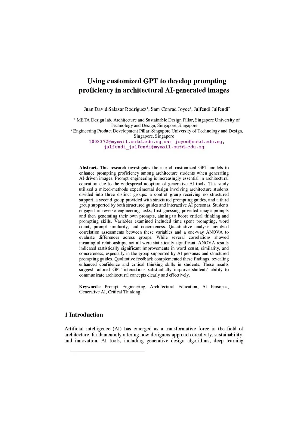 This research investigates the use of customized GPT models to enhance prompting proficiency among architecture students when generating AI-driven images. Prompt engineering is increasingly essential in architectural education due to the widespread adoption of generative AI tools. This study utilized a mixed-methods experimental design involving architecture students divided into three distinct groups: a control group receiving no structured support, a second group provided with structured prompting guides, and a third group supported by both structured guides and interactive AI personas. Students engaged in reverse engineering tasks, first guessing provided image prompts and then generating their own prompts, aiming to boost critical thinking and prompting skills. Variables examined included time spent prompting, word count, prompt similarity, and concreteness. Quantitative analysis involved correlation assessments between these variables and a one-way ANOVA to evaluate differences across groups. While several correlations showed meaningful relationships, not all were statistically significant. ANOVA results indicated statistically significant improvements in word count, similarity, and concreteness, especially in the group supported by AI personas and structured prompting guides. Qualitative feedback complemented these findings, revealing enhanced confidence and critical thinking skills in students. These results suggest tailored GPT interactions substantially improve students' ability to communicate architectural concepts clearly and effectively.