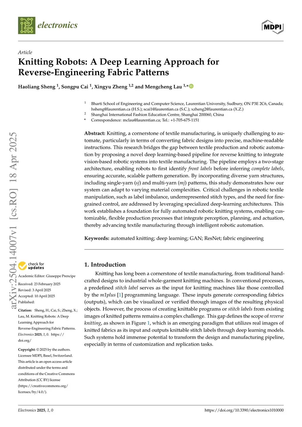 Knitting, a cornerstone of textile manufacturing, is uniquely challenging to automate, particularly in terms of converting fabric designs into precise, machine-readable instructions. This research bridges the gap between textile production and robotic automation by proposing a novel deep learning-based pipeline for reverse knitting to integrate vision-based robotic systems into textile manufacturing. The pipeline employs a two-stage architecture, enabling robots to first identify front labels before inferring complete labels, ensuring accurate, scalable pattern generation. By incorporating diverse yarn structures, including single-yarn (sj) and multi-yarn (mj) patterns, this study demonstrates how our system can adapt to varying material complexities. Critical challenges in robotic textile manipulation, such as label imbalance, underrepresented stitch types, and the need for fine-grained control, are addressed by leveraging specialized deep-learning architectures. This work establishes a foundation for fully automated robotic knitting systems, enabling customizable, flexible production processes that integrate perception, planning, and actuation, thereby advancing textile manufacturing through intelligent robotic automation.