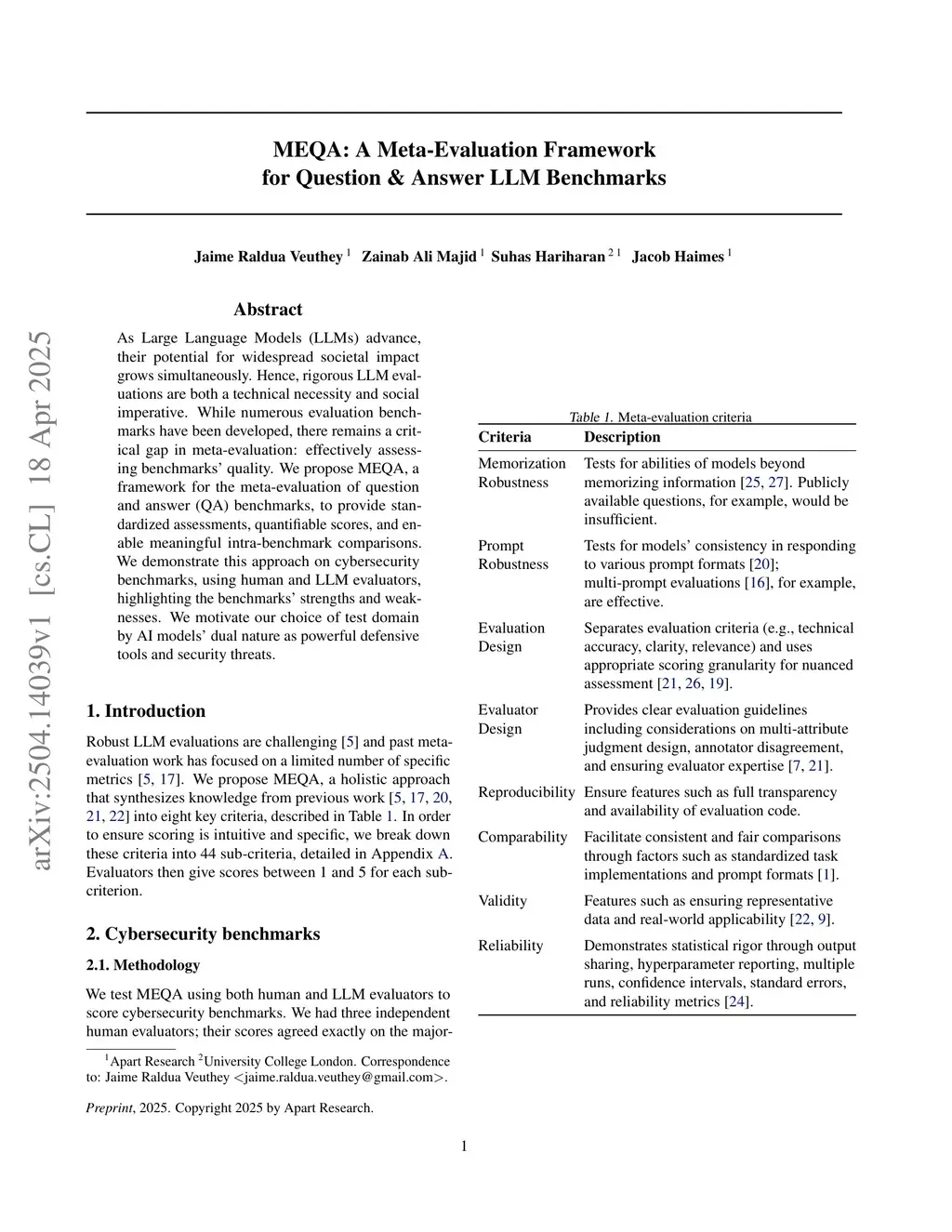 As Large Language Models (LLMs) advance, their potential for widespread societal impact grows simultaneously. Hence, rigorous LLM evaluations are both a technical necessity and social imperative. While numerous evaluation benchmarks have been developed, there remains a critical gap in meta-evaluation: effectively assessing benchmarks' quality. We propose MEQA, a framework for the meta-evaluation of question and answer (QA) benchmarks, to provide standardized assessments, quantifiable scores, and enable meaningful intra-benchmark comparisons. We demonstrate this approach on cybersecurity benchmarks, using human and LLM evaluators, highlighting the benchmarks' strengths and weaknesses. We motivate our choice of test domain by AI models' dual nature as powerful defensive tools and security threats.
