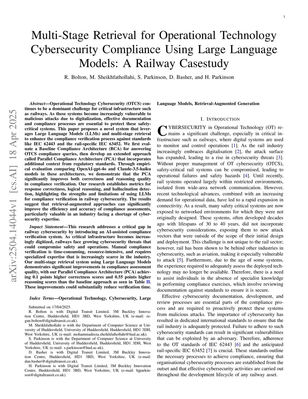 Operational Technology Cybersecurity (OTCS) continues to be a dominant challenge for critical infrastructure such as railways. As these systems become increasingly vulnerable to malicious attacks due to digitalization, effective documentation and compliance processes are essential to protect these safety-critical systems. This paper proposes a novel system that leverages Large Language Models (LLMs) and multi-stage retrieval to enhance the compliance verification process against standards like IEC 62443 and the rail-specific IEC 63452. We first evaluate a Baseline Compliance Architecture (BCA) for answering OTCS compliance queries, then develop an extended approach called Parallel Compliance Architecture (PCA) that incorporates additional context from regulatory standards. Through empirical evaluation comparing OpenAI-gpt-4o and Claude-3.5-haiku models in these architectures, we demonstrate that the PCA significantly improves both correctness and reasoning quality in compliance verification. Our research establishes metrics for response correctness, logical reasoning, and hallucination detection, highlighting the strengths and limitations of using LLMs for compliance verification in railway cybersecurity. The results suggest that retrieval-augmented approaches can significantly improve the efficiency and accuracy of compliance assessments, particularly valuable in an industry facing a shortage of cybersecurity expertise.