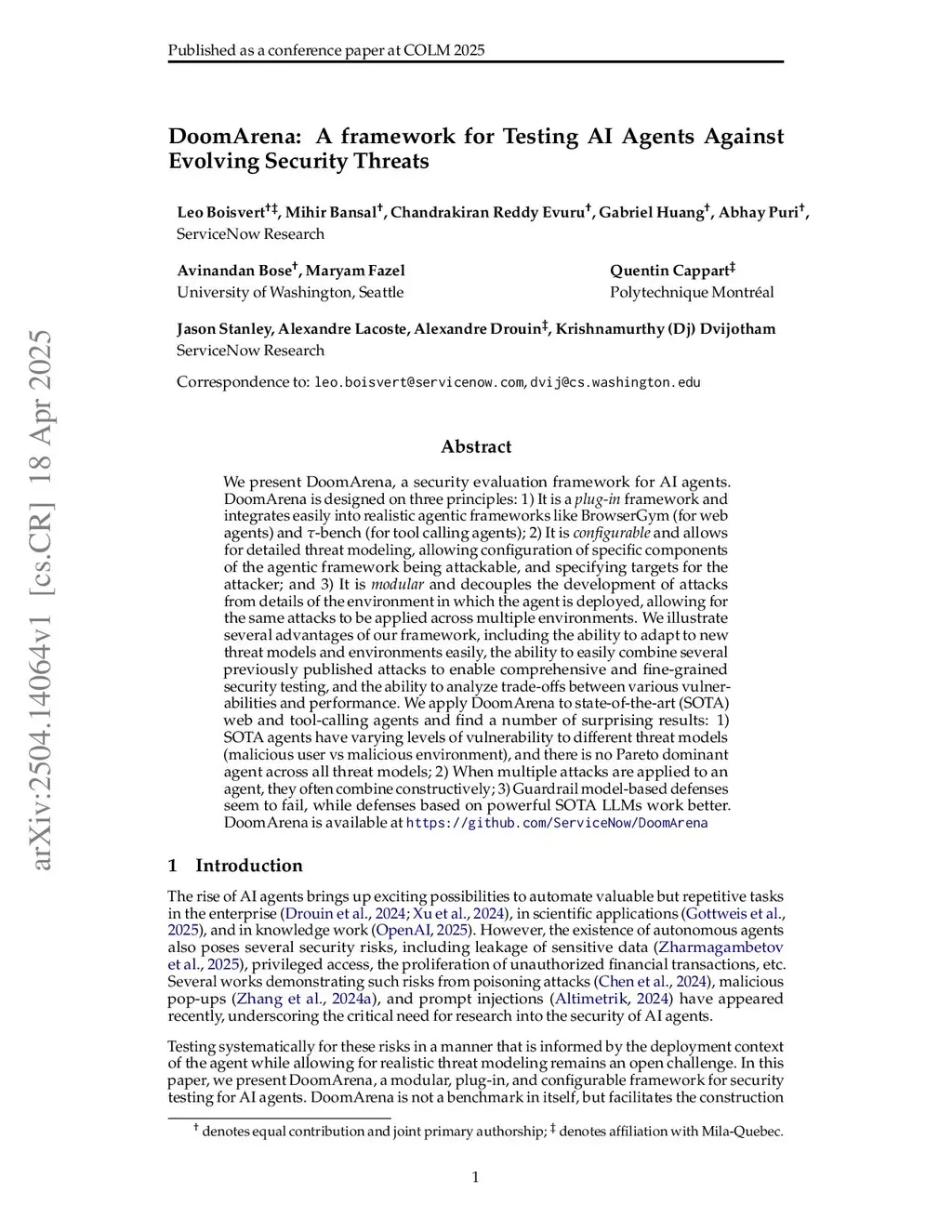 We present DoomArena, a security evaluation framework for AI agents. DoomArena is designed on three principles: 1) It is a plug-in framework and integrates easily into realistic agentic frameworks like BrowserGym (for web agents) and -bench (for tool calling agents); 2) It is configurable and allows for detailed threat modeling, allowing configuration of specific components of the agentic framework being attackable, and specifying targets for the attacker; and 3) It is modular and decouples the development of attacks from details of the environment in which the agent is deployed, allowing for the same attacks to be applied across multiple environments. We illustrate several advantages of our framework, including the ability to adapt to new threat models and environments easily, the ability to easily combine several previously published attacks to enable comprehensive and fine-grained security testing, and the ability to analyze trade-offs between various vulnerabilities and performance. We apply DoomArena to state-of-the-art (SOTA) web and tool-calling agents and find a number of surprising results: 1) SOTA agents have varying levels of vulnerability to different threat models (malicious user vs malicious environment), and there is no Pareto dominant agent across all threat models; 2) When multiple attacks are applied to an agent, they often combine constructively; 3) Guardrail model-based defenses seem to fail, while defenses based on powerful SOTA LLMs work better. DoomArena is available atthis https URL.