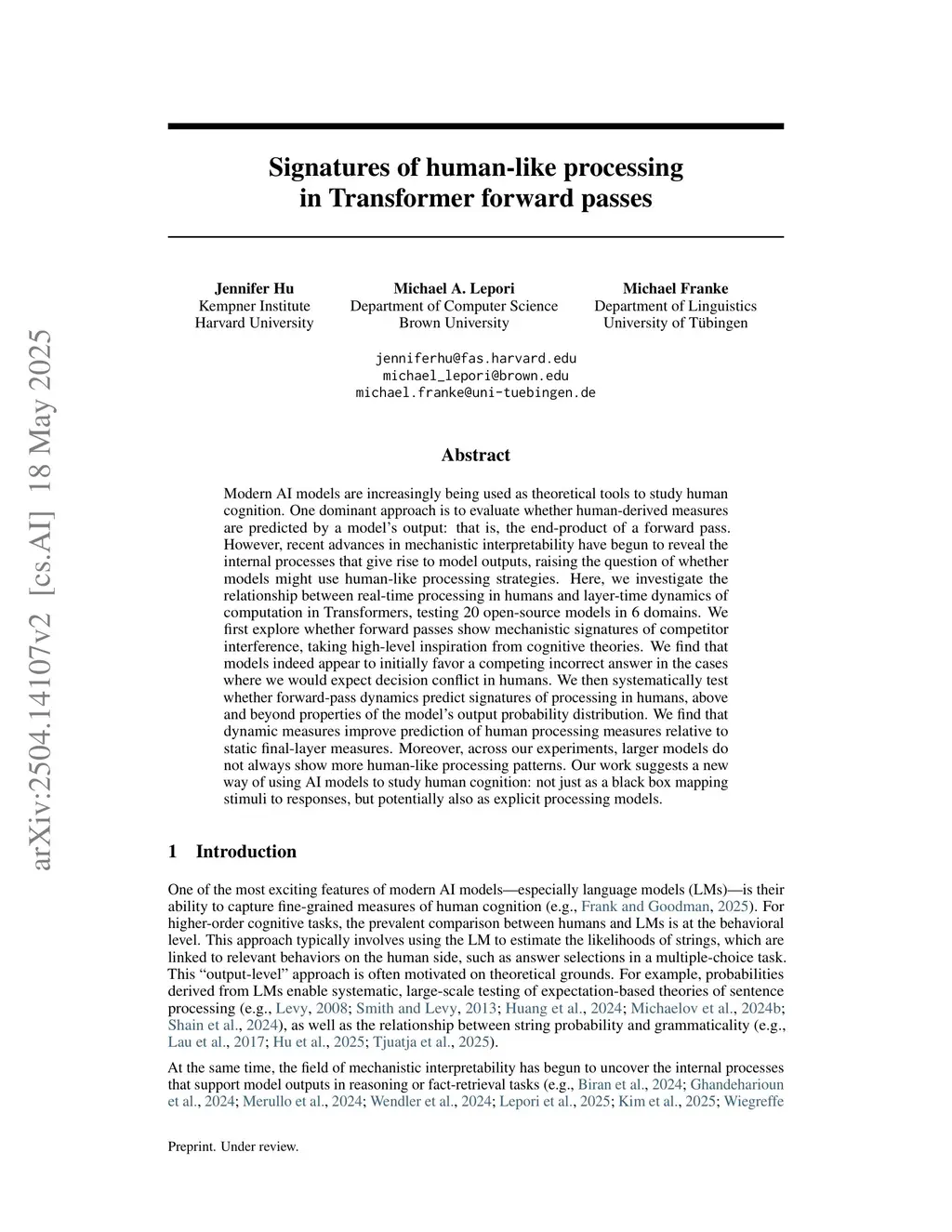 Modern AI models are increasingly being used as theoretical tools to study human cognition. One dominant approach is to evaluate whether human-derived measures are predicted by a model's output: that is, the end-product of a forward pass. However, recent advances in mechanistic interpretability have begun to reveal the internal processes that give rise to model outputs, raising the question of whether models might use human-like processing strategies. Here, we investigate the relationship between real-time processing in humans and layer-time dynamics of computation in Transformers, testing 20 open-source models in 6 domains. We first explore whether forward passes show mechanistic signatures of competitor interference, taking high-level inspiration from cognitive theories. We find that models indeed appear to initially favor a competing incorrect answer in the cases where we would expect decision conflict in humans. We then systematically test whether forward-pass dynamics predict signatures of processing in humans, above and beyond properties of the model's output probability distribution. We find that dynamic measures improve prediction of human processing measures relative to static final-layer measures. Moreover, across our experiments, larger models do not always show more human-like processing patterns. Our work suggests a new way of using AI models to study human cognition: not just as a black box mapping stimuli to responses, but potentially also as explicit processing models.