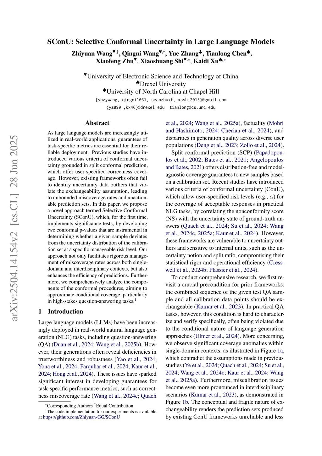 As large language models are increasingly utilized in real-world applications, guarantees of task-specific metrics are essential for their reliable deployment. Previous studies have introduced various criteria of conformal uncertainty grounded in split conformal prediction, which offer user-specified correctness coverage. However, existing frameworks often fail to identify uncertainty data outliers that violate the exchangeability assumption, leading to unbounded miscoverage rates and unactionable prediction sets. In this paper, we propose a novel approach termed Selective Conformal Uncertainty (SConU), which, for the first time, implements significance tests, by developing two conformal p-values that are instrumental in determining whether a given sample deviates from the uncertainty distribution of the calibration set at a specific manageable risk level. Our approach not only facilitates rigorous management of miscoverage rates across both single-domain and interdisciplinary contexts, but also enhances the efficiency of predictions. Furthermore, we comprehensively analyze the components of the conformal procedures, aiming to approximate conditional coverage, particularly in high-stakes question-answering tasks.