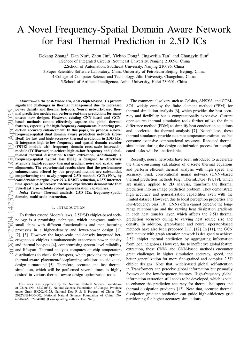 In the post-Moore era, 2.5D chiplet-based ICs present significant challenges in thermal management due to increased power density and thermal hotspots. Neural network-based thermal prediction models can perform real-time predictions for many unseen new designs. However, existing CNN-based and GCN-based methods cannot effectively capture the global thermal features, especially for high-frequency components, hindering prediction accuracy enhancement. In this paper, we propose a novel frequency-spatial dual domain aware prediction network (FSA-Heat) for fast and high-accuracy thermal prediction in 2.5D ICs. It integrates high-to-low frequency and spatial domain encoder (FSTE) module with frequency domain cross-scale interaction module (FCIFormer) to achieve high-to-low frequency and global-to-local thermal dissipation feature extraction. Additionally, a frequency-spatial hybrid loss (FSL) is designed to effectively attenuate high-frequency thermal gradient noise and spatial misalignments. The experimental results show that the performance enhancements offered by our proposed method are substantial, outperforming the newly-proposed 2.5D method, GCN+PNA, by considerable margins (over 99% RMSE reduction, 4.23X inference time speedup). Moreover, extensive experiments demonstrate that FSA-Heat also exhibits robust generalization capabilities.