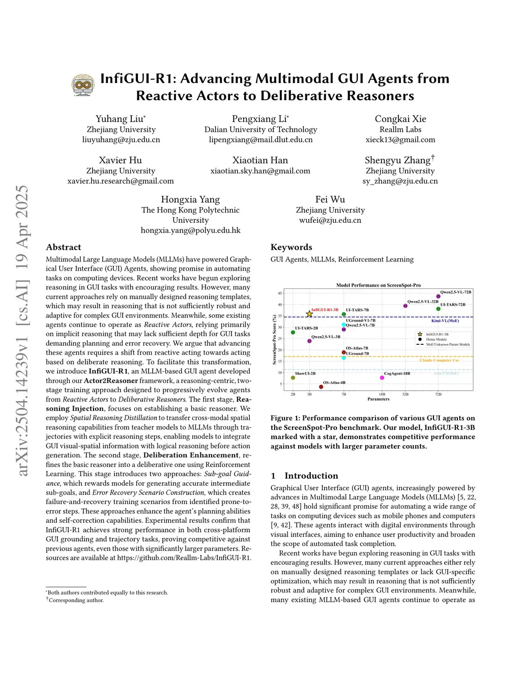 Multimodal Large Language Models (MLLMs) have powered Graphical User Interface (GUI) Agents, showing promise in automating tasks on computing devices. Recent works have begun exploring reasoning in GUI tasks with encouraging results. However, many current approaches rely on manually designed reasoning templates, which may result in reasoning that is not sufficiently robust and adaptive for complex GUI environments. Meanwhile, some existing agents continue to operate as Reactive Actors, relying primarily on implicit reasoning that may lack sufficient depth for GUI tasks demanding planning and error recovery. We argue that advancing these agents requires a shift from reactive acting towards acting based on deliberate reasoning. To facilitate this transformation, we introduce InfiGUI-R1, an MLLM-based GUI agent developed through our Actor2Reasoner framework, a reasoning-centric, two-stage training approach designed to progressively evolve agents from Reactive Actors to Deliberative Reasoners. The first stage, Reasoning Injection, focuses on establishing a basic reasoner. We employ Spatial Reasoning Distillation to transfer cross-modal spatial reasoning capabilities from teacher models to MLLMs through trajectories with explicit reasoning steps, enabling models to integrate GUI visual-spatial information with logical reasoning before action generation. The second stage, Deliberation Enhancement, refines the basic reasoner into a deliberative one using Reinforcement Learning. This stage introduces two approaches: Sub-goal Guidance, which rewards models for generating accurate intermediate sub-goals, and Error Recovery Scenario Construction, which creates failure-and-recovery training scenarios from identified prone-to-error steps. Experimental results show InfiGUI-R1 achieves strong performance in GUI grounding and trajectory tasks. Resources atthis https URL.