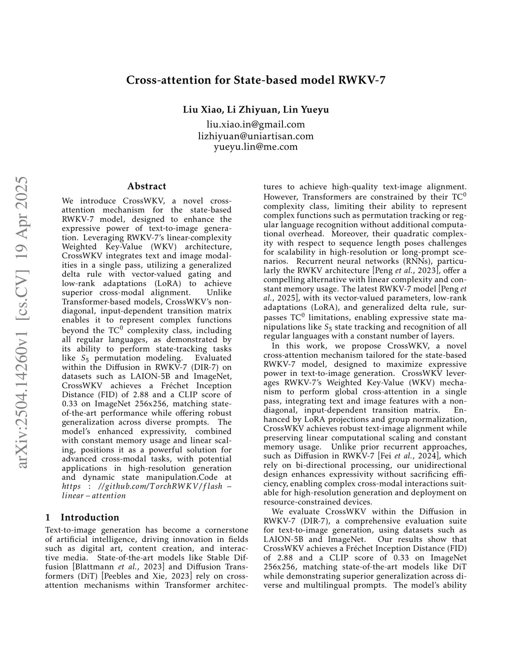 We introduce CrossWKV, a novel cross-attention mechanism for the state-based RWKV-7 model, designed to enhance the expressive power of text-to-image generation. Leveraging RWKV-7's linear-complexity Weighted Key-Value (WKV) architecture, CrossWKV integrates text and image modalities in a single pass, utilizing a generalized delta rule with vector-valued gating and low-rank adaptations (LoRA) to achieve superior cross-modal alignment. Unlike Transformer-based models, CrossWKV's non-diagonal, input-dependent transition matrix enables it to represent complex functions beyond the complexity class, including all regular languages, as demonstrated by its ability to perform state-tracking tasks like permutation modeling. Evaluated within the Diffusion in RWKV-7 (DIR-7) on datasets such as LAION-5B and ImageNet, CrossWKV achieves a Frechet Inception Distance (FID) of 2.88 and a CLIP score of 0.33 on ImageNet 256x256, matching state-of-the-art performance while offering robust generalization across diverse prompts. The model's enhanced expressivity, combined with constant memory usage and linear scaling, positions it as a powerful solution for advanced cross-modal tasks, with potential applications in high-resolution generation and dynamic statethis http URLatthis https URL
