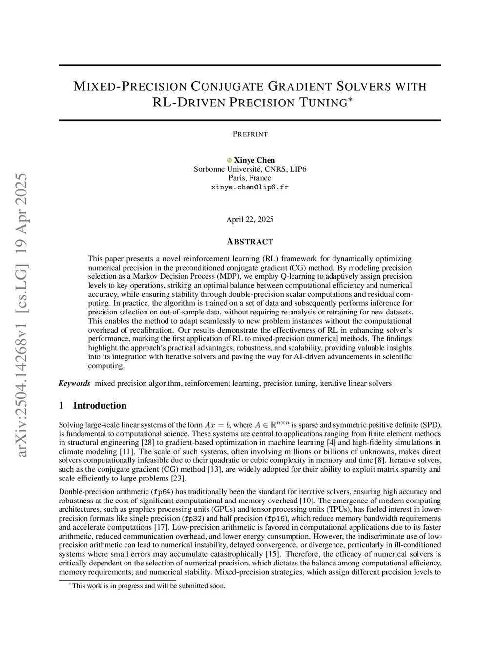 This paper presents a novel reinforcement learning (RL) framework for dynamically optimizing numerical precision in the preconditioned conjugate gradient (CG) method. By modeling precision selection as a Markov Decision Process (MDP), we employ Q-learning to adaptively assign precision levels to key operations, striking an optimal balance between computational efficiency and numerical accuracy, while ensuring stability through double-precision scalar computations and residual computing. In practice, the algorithm is trained on a set of data and subsequently performs inference for precision selection on out-of-sample data, without requiring re-analysis or retraining for new datasets. This enables the method to adapt seamlessly to new problem instances without the computational overhead of recalibration. Our results demonstrate the effectiveness of RL in enhancing solver's performance, marking the first application of RL to mixed-precision numerical methods. The findings highlight the approach's practical advantages, robustness, and scalability, providing valuable insights into its integration with iterative solvers and paving the way for AI-driven advancements in scientific computing.