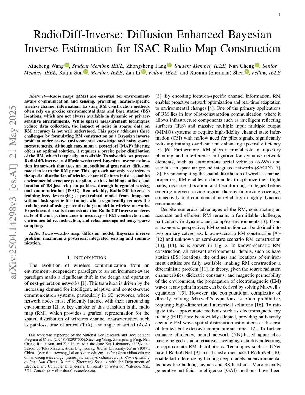 Radio maps (RMs) are essential for environment-aware communication and sensing, providing location-specific wireless channel information. Existing RM construction methods often rely on precise environmental data and base station (BS) locations, which are not always available in dynamic or privacy-sensitive environments. While sparse measurement techniques reduce data collection, the impact of noise in sparse data on RM accuracy is not well understood. This paper addresses these challenges by formulating RM construction as a Bayesian inverse problem under coarse environmental knowledge and noisy sparse measurements. Although maximum a posteriori (MAP) filtering offers an optimal solution, it requires a precise prior distribution of the RM, which is typically unavailable. To solve this, we propose RadioDiff-Inverse, a diffusion-enhanced Bayesian inverse estimation framework that uses an unconditional generative diffusion model to learn the RM prior. This approach not only reconstructs the spatial distribution of wireless channel features but also enables environmental structure perception, such as building outlines, and location of BS just relay on pathloss, through integrated sensing and communication (ISAC). Remarkably, RadioDiff-Inverse is training-free, leveraging a pre-trained model from Imagenet without task-specific fine-tuning, which significantly reduces the training cost of using generative large model in wireless networks. Experimental results demonstrate that RadioDiff-Inverse achieves state-of-the-art performance in accuracy of RM construction and environmental reconstruction, and robustness against noisy sparse sampling.