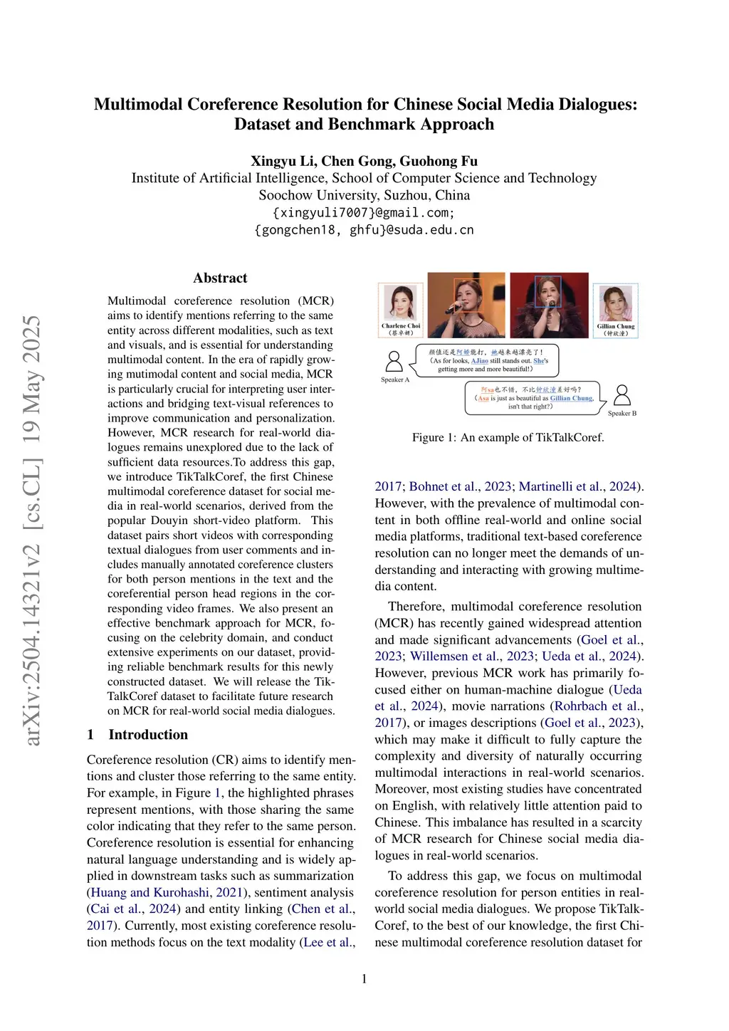 Multimodal coreference resolution (MCR) aims to identify mentions referring to the same entity across different modalities, such as text and visuals, and is essential for understanding multimodal content. In the era of rapidly growing mutimodal content and social media, MCR is particularly crucial for interpreting user interactions and bridging text-visual references to improve communication and personalization. However, MCR research for real-world dialogues remains unexplored due to the lack of sufficient data resources. To address this gap, we introduce TikTalkCoref, the first Chinese multimodal coreference dataset for social media in real-world scenarios, derived from the popular Douyin short-video platform. This dataset pairs short videos with corresponding textual dialogues from user comments and includes manually annotated coreference clusters for both person mentions in the text and the coreferential person head regions in the corresponding video frames. We also present an effective benchmark approach for MCR, focusing on the celebrity domain, and conduct extensive experiments on our dataset, providing reliable benchmark results for this newly constructed dataset. We will release the TikTalkCoref dataset to facilitate future research on MCR for real-world social media dialogues.