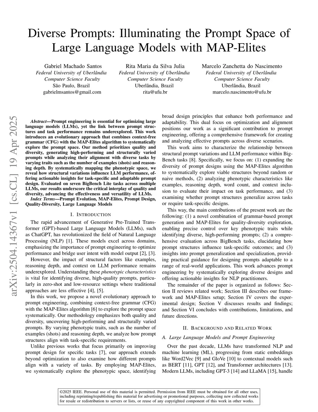 Prompt engineering is essential for optimizing large language models (LLMs), yet the link between prompt structures and task performance remains underexplored. This work introduces an evolutionary approach that combines context-free grammar (CFG) with the MAP-Elites algorithm to systematically explore the prompt space. Our method prioritizes quality and diversity, generating high-performing and structurally varied prompts while analyzing their alignment with diverse tasks by varying traits such as the number of examples (shots) and reasoning depth. By systematically mapping the phenotypic space, we reveal how structural variations influence LLM performance, offering actionable insights for task-specific and adaptable prompt design. Evaluated on seven BigBench Lite tasks across multiple LLMs, our results underscore the critical interplay of quality and diversity, advancing the effectiveness and versatility of LLMs.