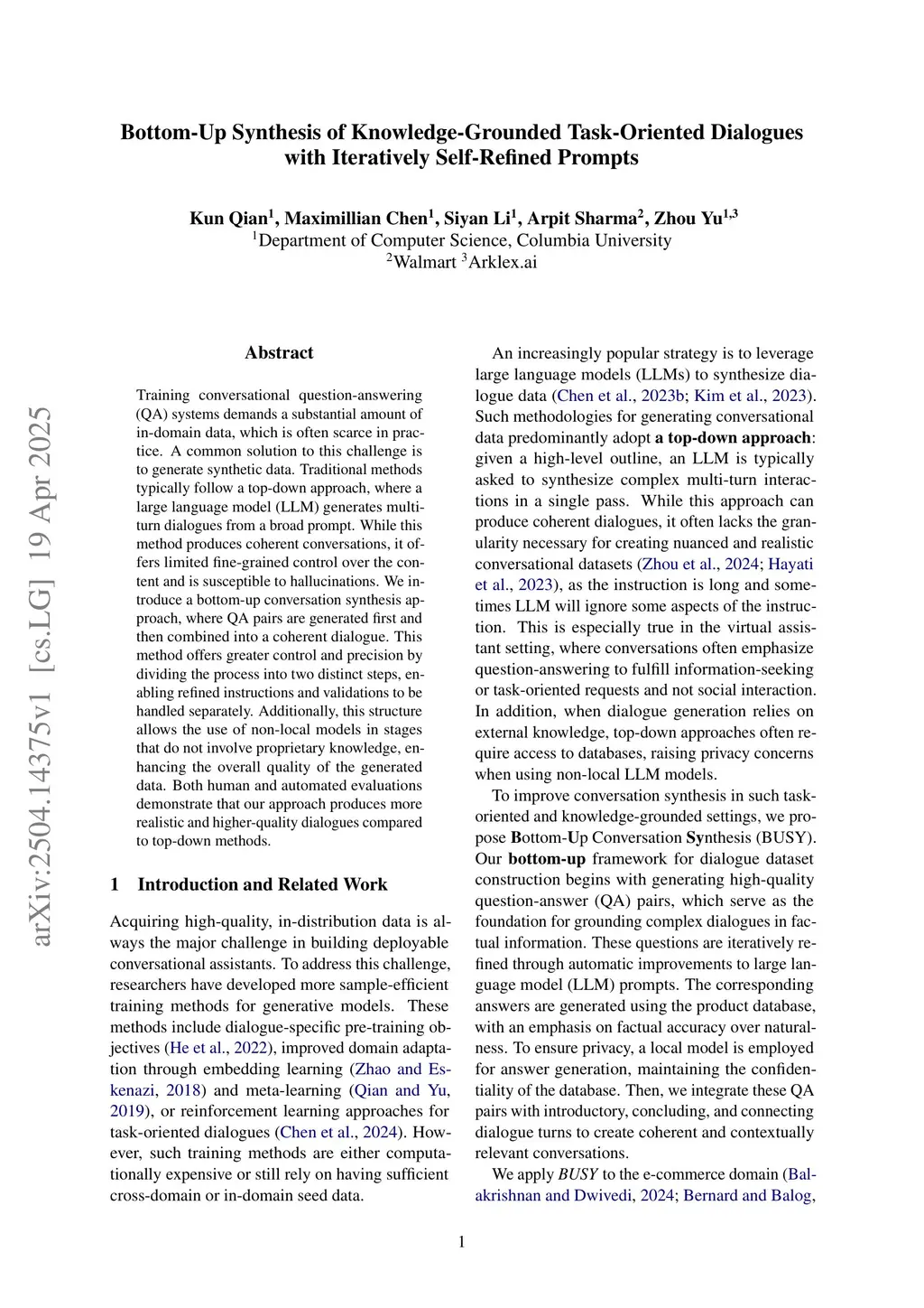 Training conversational question-answering (QA) systems requires a substantial amount of in-domain data, which is often scarce in practice. A common solution to this challenge is to generate synthetic data. Traditional methods typically follow a top-down approach, where a large language model (LLM) generates multi-turn dialogues from a broad prompt. Although this method produces coherent conversations, it offers limited fine-grained control over the content and is susceptible to hallucinations. We introduce a bottom-up conversation synthesis approach, where QA pairs are generated first and then combined into a coherent dialogue. This method offers greater control and precision by dividing the process into two distinct steps, allowing refined instructions and validations to be handled separately. Additionally, this structure allows the use of non-local models in stages that do not involve proprietary knowledge, enhancing the overall quality of the generated data. Both human and automated evaluations demonstrate that our approach produces more realistic and higher-quality dialogues compared to top-down methods.