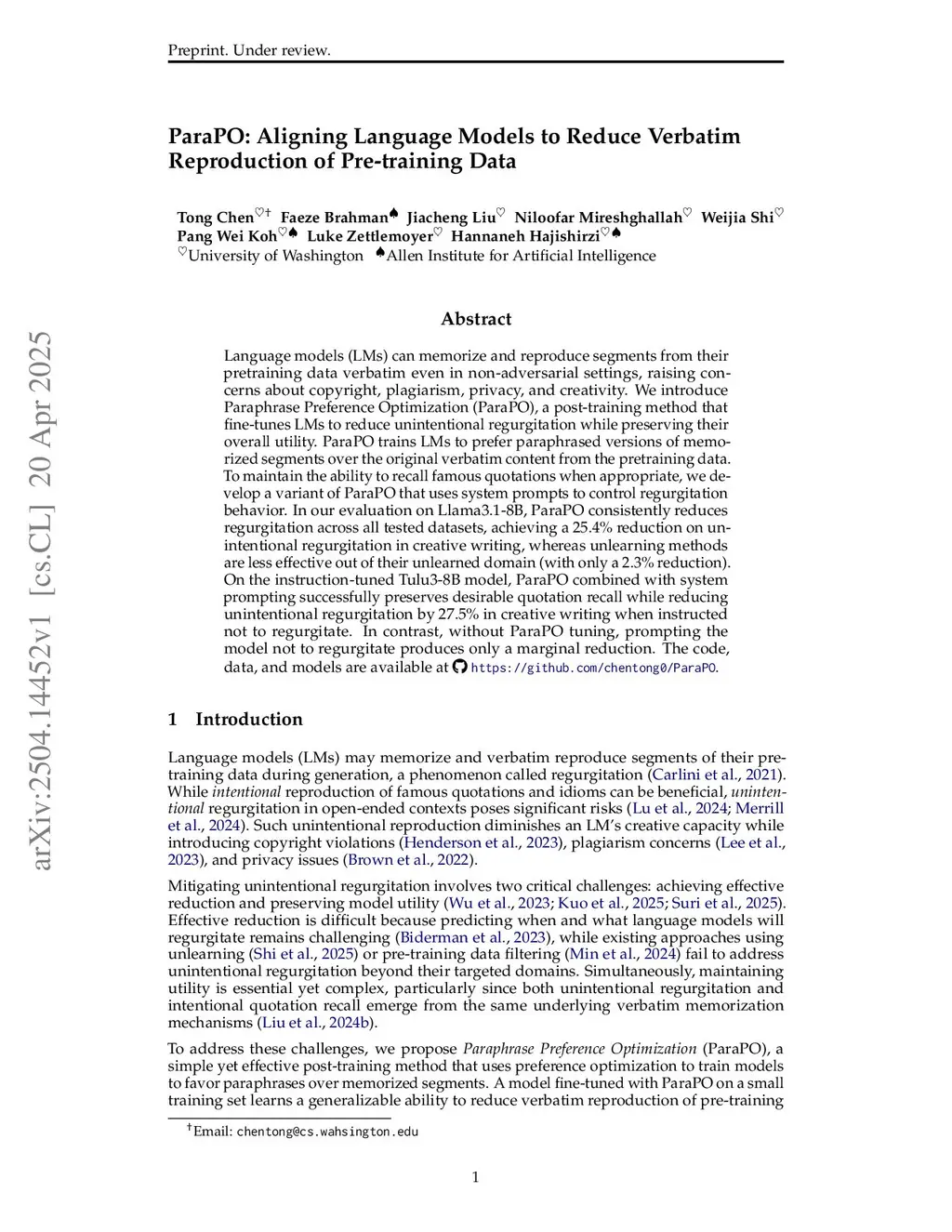 Language models (LMs) can memorize and reproduce segments from their pretraining data verbatim even in non-adversarial settings, raising concerns about copyright, plagiarism, privacy, and creativity. We introduce Paraphrase Preference Optimization (ParaPO), a post-training method that fine-tunes LMs to reduce unintentional regurgitation while preserving their overall utility. ParaPO trains LMs to prefer paraphrased versions of memorized segments over the original verbatim content from the pretraining data. To maintain the ability to recall famous quotations when appropriate, we develop a variant of ParaPO that uses system prompts to control regurgitation behavior. In our evaluation on Llama3.1-8B, ParaPO consistently reduces regurgitation across all tested datasets (e.g., reducing the regurgitation metric from 17.3 to 12.9 in creative writing), whereas unlearning methods used in prior work to mitigate regurgitation are less effective outside their targeted unlearned domain (from 17.3 to 16.9). When applied to the instruction-tuned Tulu3-8B model, ParaPO with system prompting successfully preserves famous quotation recall while reducing unintentional regurgitation (from 8.7 to 6.3 in creative writing) when prompted not to regurgitate. In contrast, without ParaPO tuning, prompting the model not to regurgitate produces only a marginal reduction (8.7 to 8.4).