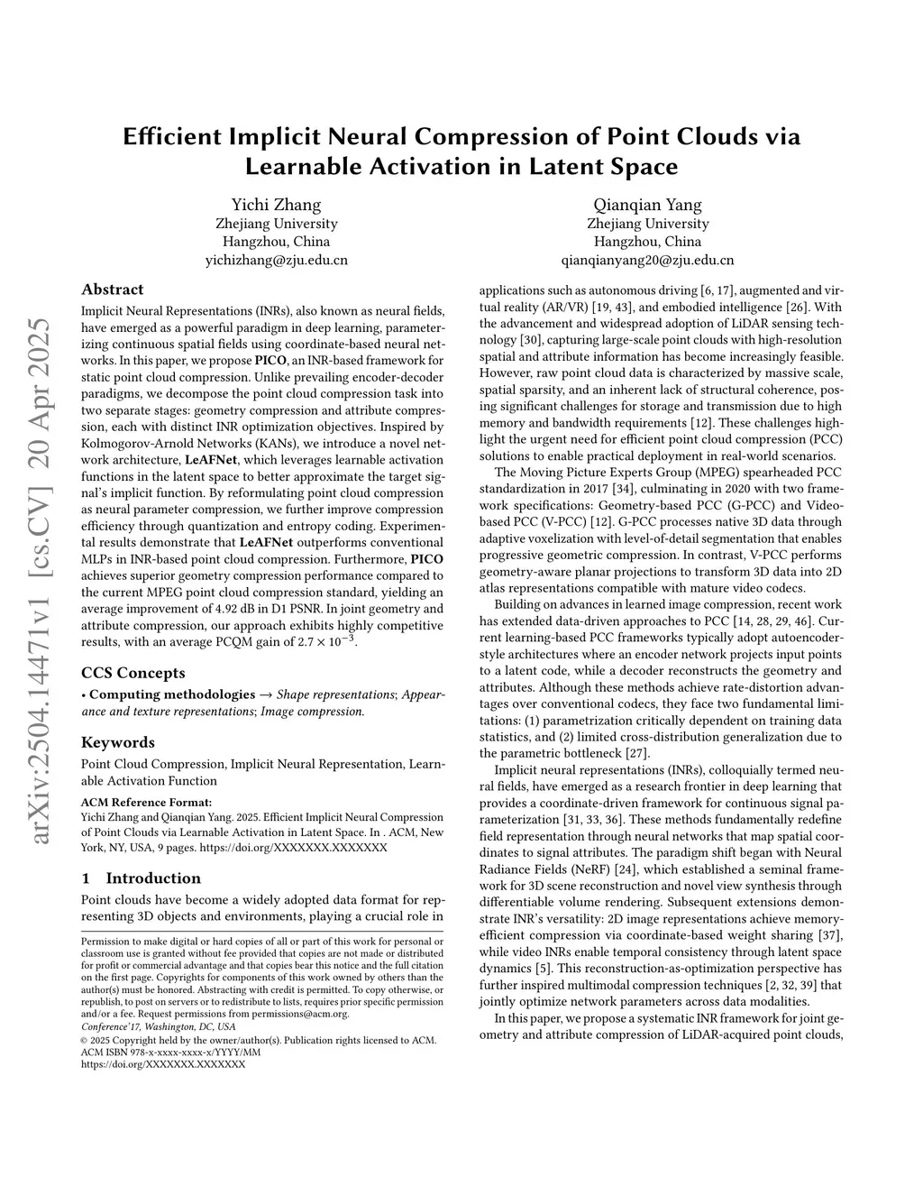 Implicit Neural Representations (INRs), also known as neural fields, have emerged as a powerful paradigm in deep learning, parameterizing continuous spatial fields using coordinate-based neural networks. In this paper, we propose \textbf{PICO}, an INR-based framework for static point cloud compression. Unlike prevailing encoder-decoder paradigms, we decompose the point cloud compression task into two separate stages: geometry compression and attribute compression, each with distinct INR optimization objectives. Inspired by Kolmogorov-Arnold Networks (KANs), we introduce a novel network architecture, \textbf{LeAFNet}, which leverages learnable activation functions in the latent space to better approximate the target signal's implicit function. By reformulating point cloud compression as neural parameter compression, we further improve compression efficiency through quantization and entropy coding. Experimental results demonstrate that \textbf{LeAFNet} outperforms conventional MLPs in INR-based point cloud compression. Furthermore, \textbf{PICO} achieves superior geometry compression performance compared to the current MPEG point cloud compression standard, yielding an average improvement of dB in D1 PSNR. In joint geometry and attribute compression, our approach exhibits highly competitive results, with an average PCQM gain of .