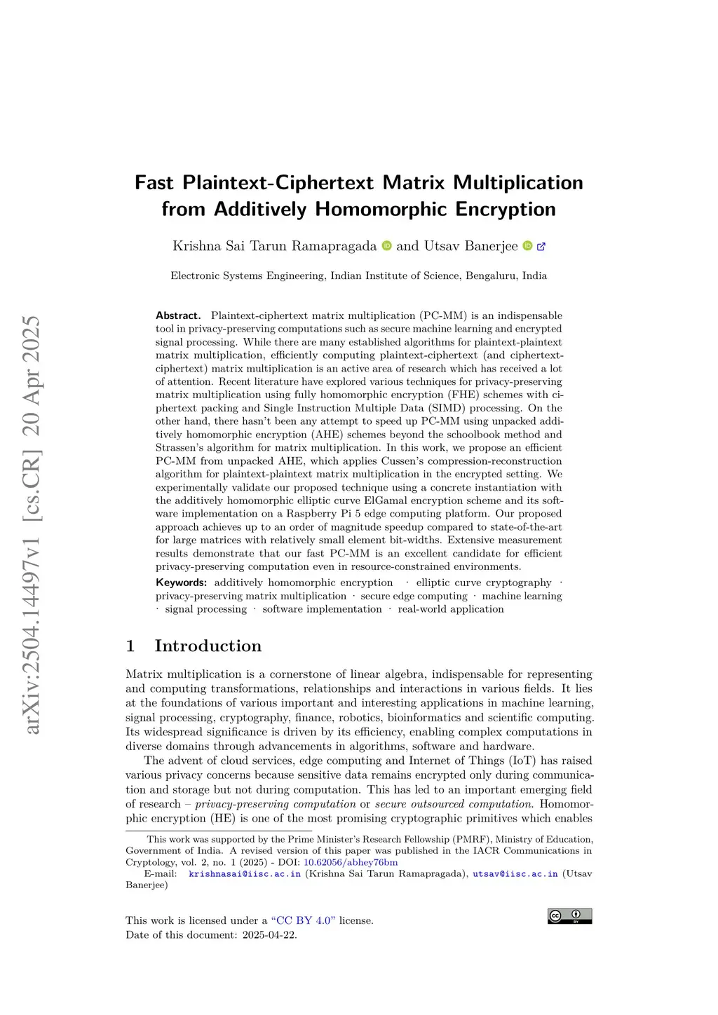 Plaintext-ciphertext matrix multiplication (PC-MM) is an indispensable tool in privacy-preserving computations such as secure machine learning and encrypted signal processing. While there are many established algorithms for plaintext-plaintext matrix multiplication, efficiently computing plaintext-ciphertext (and ciphertext-ciphertext) matrix multiplication is an active area of research which has received a lot of attention. Recent literature have explored various techniques for privacy-preserving matrix multiplication using fully homomorphic encryption (FHE) schemes with ciphertext packing and Single Instruction Multiple Data (SIMD) processing. On the other hand, there hasn't been any attempt to speed up PC-MM using unpacked additively homomorphic encryption (AHE) schemes beyond the schoolbook method and Strassen's algorithm for matrix multiplication. In this work, we propose an efficient PC-MM from unpacked AHE, which applies Cussen's compression-reconstruction algorithm for plaintext-plaintext matrix multiplication in the encrypted setting. We experimentally validate our proposed technique using a concrete instantiation with the additively homomorphic elliptic curve ElGamal encryption scheme and its software implementation on a Raspberry Pi 5 edge computing platform. Our proposed approach achieves up to an order of magnitude speedup compared to state-of-the-art for large matrices with relatively small element bit-widths. Extensive measurement results demonstrate that our fast PC-MM is an excellent candidate for efficient privacy-preserving computation even in resource-constrained environments.
