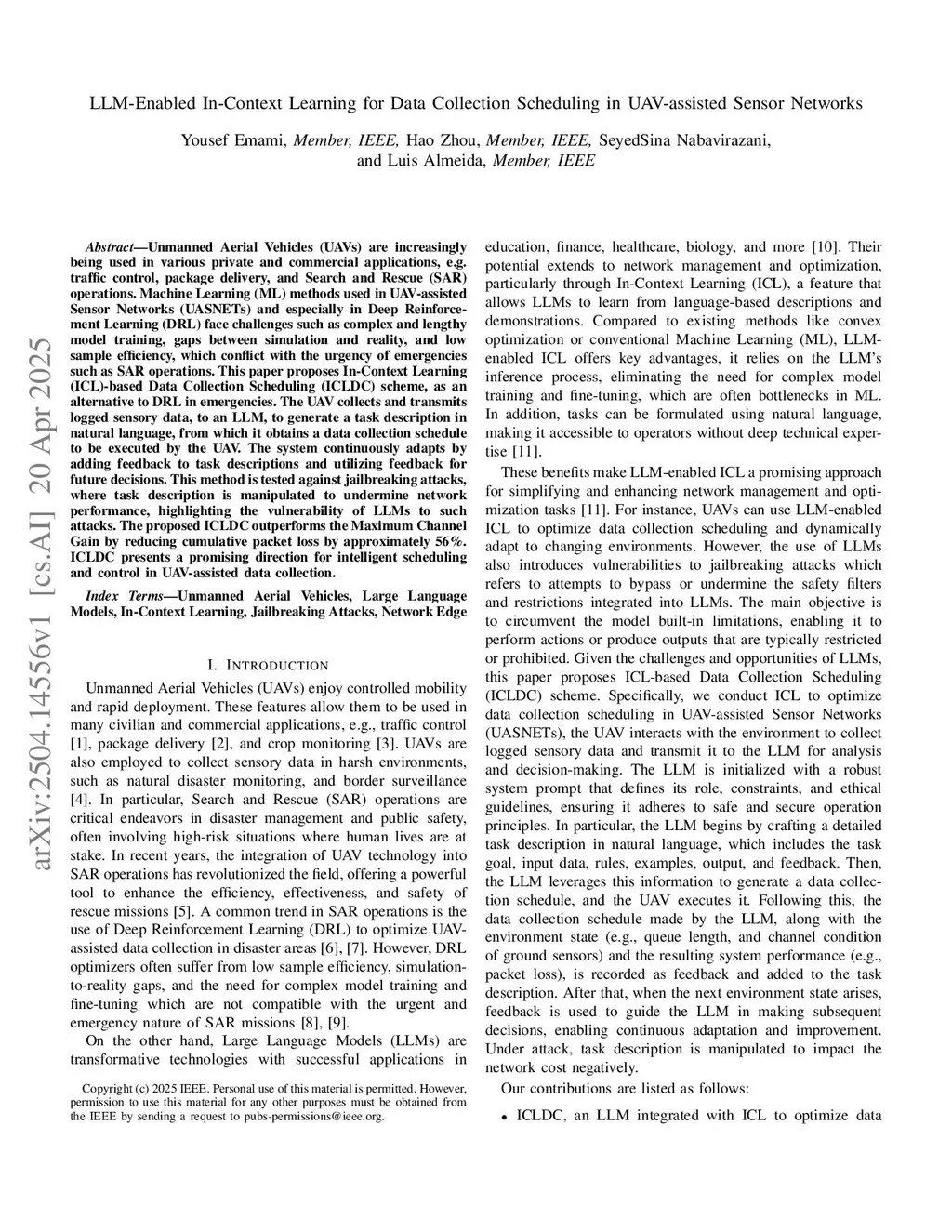 Unmanned Aerial Vehicles (UAVs) are increasingly being utilized in various private and commercial applications, e.g., traffic control, parcel delivery, and Search and Rescue (SAR) missions. Machine Learning (ML) methods used in UAV-Assisted Sensor Networks (UASNETs) and, especially, in Deep Reinforcement Learning (DRL) face challenges such as complex and lengthy model training, gaps between simulation and reality, and low sampling efficiency, which conflict with the urgency of emergencies, such as SAR missions. In this paper, an In-Context Learning (ICL)-Data Collection Scheduling (ICLDC) system is proposed as an alternative to DRL in emergencies. The UAV collects sensory data and transmits it to a Large Language Model (LLM), which creates a task description in natural language. From this description, the UAV receives a data collection schedule that must be executed. A verifier ensures safe UAV operations by evaluating the schedules generated by the LLM and overriding unsafe schedules based on predefined rules. The system continuously adapts by incorporating feedback into the task descriptions and using this for future decisions. This method is tested against jailbreaking attacks, where the task description is manipulated to undermine network performance, highlighting the vulnerability of LLMs to such attacks. The proposed ICLDC significantly reduces cumulative packet loss compared to both the DQN and Maximum Channel Gain baselines. ICLDC presents a promising direction for intelligent scheduling and control in UASNETs.