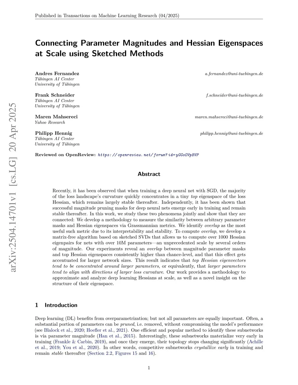 Connecting Parameter Magnitudes and Hessian Eigenspaces at Scale using Sketched Methods