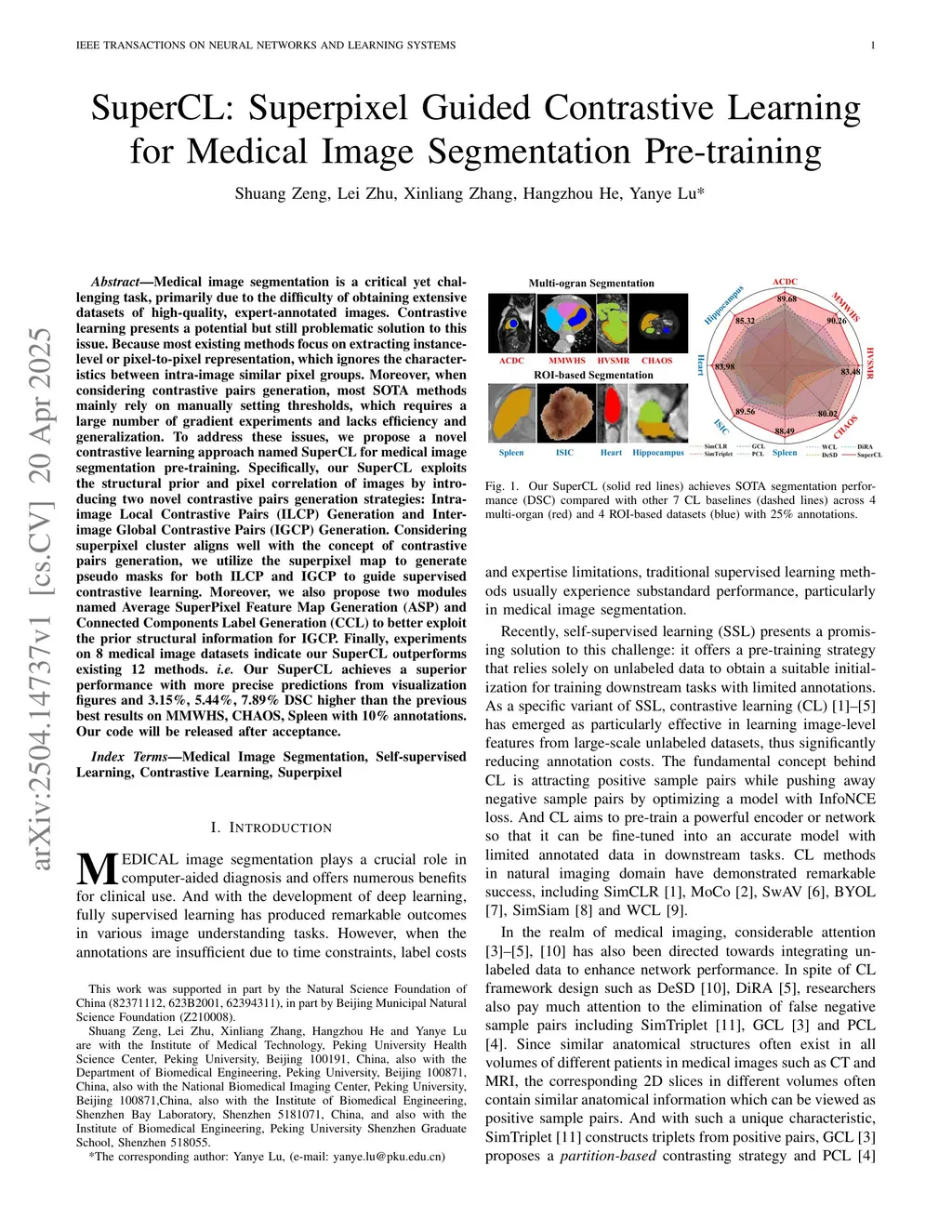 Medical image segmentation is a critical yet challenging task, primarily due to the difficulty of obtaining extensive datasets of high-quality, expert-annotated images. Contrastive learning presents a potential but still problematic solution to this issue. Because most existing methods focus on extracting instance-level or pixel-to-pixel representation, which ignores the characteristics between intra-image similar pixel groups. Moreover, when considering contrastive pairs generation, most SOTA methods mainly rely on manually setting thresholds, which requires a large number of gradient experiments and lacks efficiency and generalization. To address these issues, we propose a novel contrastive learning approach named SuperCL for medical image segmentation pre-training. Specifically, our SuperCL exploits the structural prior and pixel correlation of images by introducing two novel contrastive pairs generation strategies: Intra-image Local Contrastive Pairs (ILCP) Generation and Inter-image Global Contrastive Pairs (IGCP) Generation. Considering superpixel cluster aligns well with the concept of contrastive pairs generation, we utilize the superpixel map to generate pseudo masks for both ILCP and IGCP to guide supervised contrastive learning. Moreover, we also propose two modules named Average SuperPixel Feature Map Generation (ASP) and Connected Components Label Generation (CCL) to better exploit the prior structural information for IGCP. Finally, experiments on 8 medical image datasets indicate our SuperCL outperforms existing 12 methods. i.e. Our SuperCL achieves a superior performance with more precise predictions from visualization figures and 3.15%, 5.44%, 7.89% DSC higher than the previous best results on MMWHS, CHAOS, Spleen with 10% annotations. Our code will be released after acceptance.