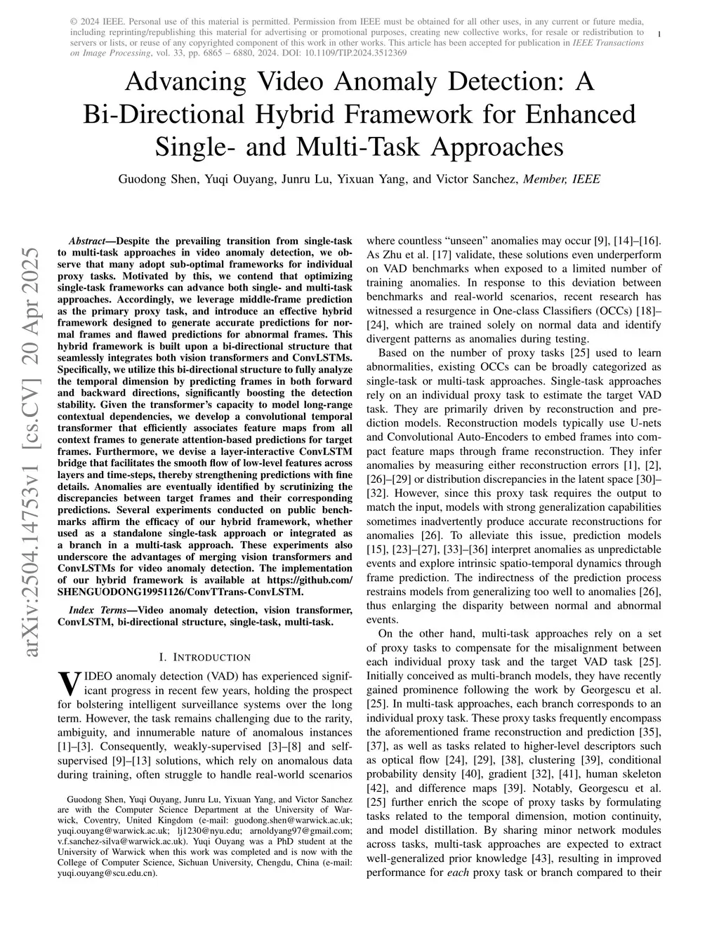 Despite the prevailing transition from single-task to multi-task approaches in video anomaly detection, we observe that many adopt sub-optimal frameworks for individual proxy tasks. Motivated by this, we contend that optimizing single-task frameworks can advance both single- and multi-task approaches. Accordingly, we leverage middle-frame prediction as the primary proxy task, and introduce an effective hybrid framework designed to generate accurate predictions for normal frames and flawed predictions for abnormal frames. This hybrid framework is built upon a bi-directional structure that seamlessly integrates both vision transformers and ConvLSTMs. Specifically, we utilize this bi-directional structure to fully analyze the temporal dimension by predicting frames in both forward and backward directions, significantly boosting the detection stability. Given the transformer's capacity to model long-range contextual dependencies, we develop a convolutional temporal transformer that efficiently associates feature maps from all context frames to generate attention-based predictions for target frames. Furthermore, we devise a layer-interactive ConvLSTM bridge that facilitates the smooth flow of low-level features across layers and time-steps, thereby strengthening predictions with fine details. Anomalies are eventually identified by scrutinizing the discrepancies between target frames and their corresponding predictions. Several experiments conducted on public benchmarks affirm the efficacy of our hybrid framework, whether used as a standalone single-task approach or integrated as a branch in a multi-task approach. These experiments also underscore the advantages of merging vision transformers and ConvLSTMs for video anomaly detection.