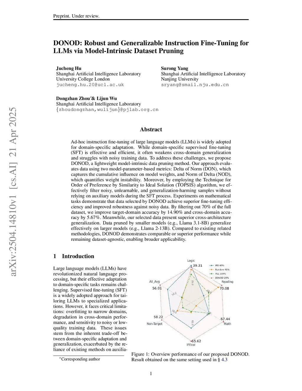 Ad-hoc instruction fine-tuning of large language models (LLMs) is widely adopted for domain-specific adaptation. While domain-specific supervised fine-tuning (SFT) is effective and efficient, it often weakens cross-domain generalization and struggles with noisy training data. To address these challenges, we propose DONOD, a lightweight model-intrinsic data pruning method. Our approach evaluates data using two model-parameter-based metrics: Delta of Norm (DON), which captures the cumulative influence on model weights, and Norm of Delta (NOD), which quantifies weight instability. Moreover, by employing the Technique for Order of Preference by Similarity to Ideal Solution (TOPSIS) algorithm, we effectively filter noisy, unlearnable, and generalization-harming samples without relying on auxiliary models during the SFT process. Experiments on mathematical tasks demonstrate that data selected by DONOD achieve superior fine-tuning efficiency and improved robustness against noisy data. By filtering out 70% of the full dataset, we improve target-domain accuracy by 14.90% and cross-domain accuracy by 5.67%. Meanwhile, our selected data present superior cross-architecture generalization. Data pruned by smaller models (e.g., Llama 3.1-8B) generalize effectively on larger models (e.g., Llama 2-13B). Compared to existing related methodologies, DONOD demonstrates comparable or superior performance while remaining dataset-agnostic, enabling broader applicability.