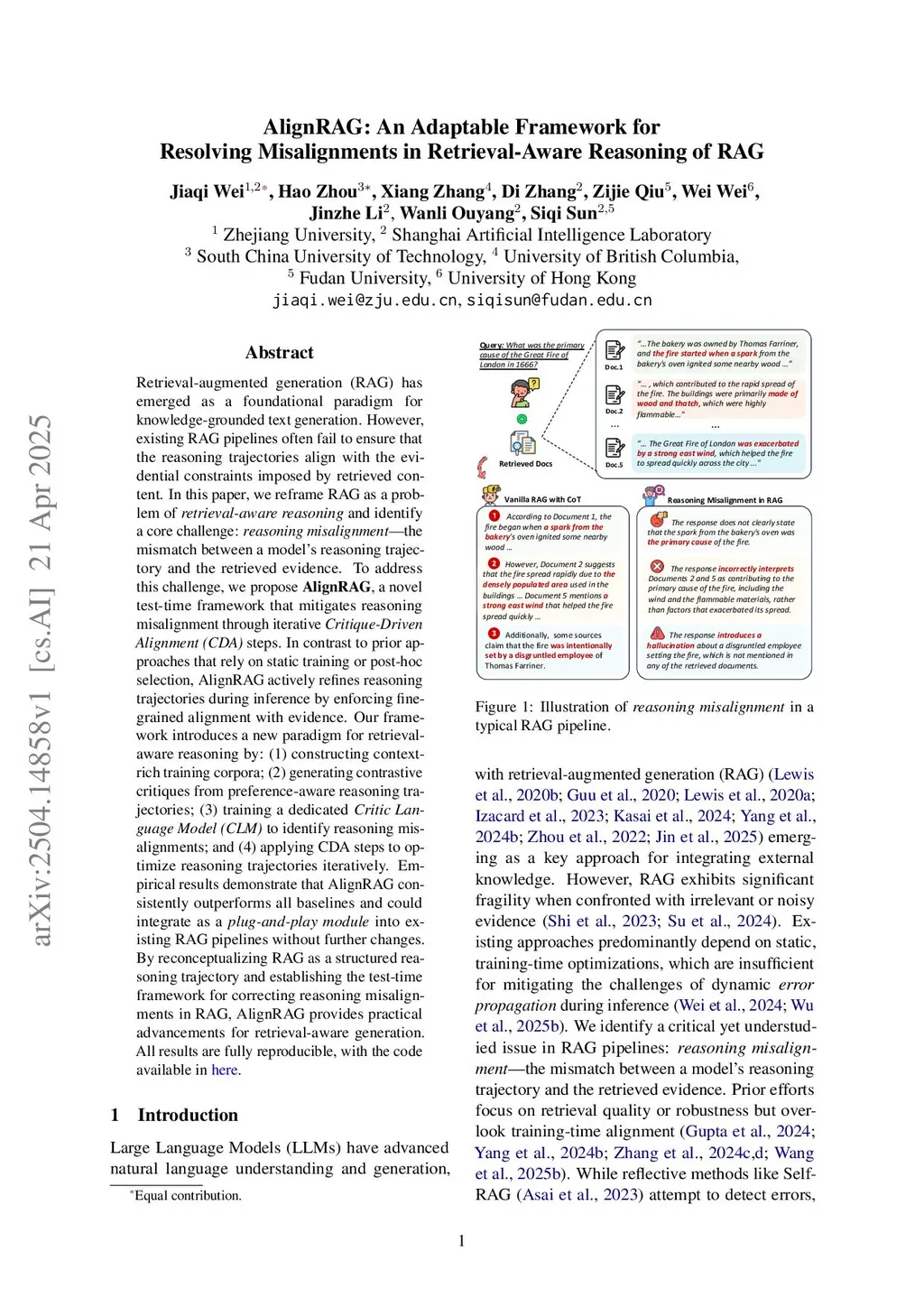 Retrieval-augmented generation (RAG) has become a widely adopted paradigm for enabling knowledge-grounded large language models (LLMs). However, standard RAG pipelines often fail to ensure that model reasoning remains consistent with the evidence retrieved, leading to factual inconsistencies or unsupported conclusions. In this work, we reinterpret RAG as Retrieval-Augmented Reasoning and identify a central but underexplored problem: Reasoning Misalignment -- the divergence between an LLM's internal reasoning trajectory and the evidential constraints provided by retrieval. To address this issue, we propose AlignRAG, a novel iterative framework grounded in Critique-Driven Alignment (CDA). We further introduce AlignRAG-auto, an autonomous variant that dynamically terminates refinement, removing the need to pre-specify the number of critique iterations. At the heart of AlignRAG lies a contrastive critique synthesis mechanism that generates retrieval-sensitive critiques while mitigating self-bias. This mechanism trains a dedicated retrieval-augmented Critic Language Model (CLM) using labeled critiques that distinguish between evidence-aligned and misaligned reasoning. Empirical evaluations show that our approach significantly improves reasoning fidelity. Our 8B-parameter CLM improves performance over the Self-Refine baseline by 12.1% on out-of-domain tasks and outperforms a standard 72B-parameter CLM by 2.2%. Furthermore, AlignRAG-auto achieves this state-of-the-art performance while dynamically determining the optimal number of refinement steps, enhancing efficiency and usability. AlignRAG remains compatible with existing RAG architectures as a plug-and-play module and demonstrates strong robustness under both informative and noisy retrieval scenarios.