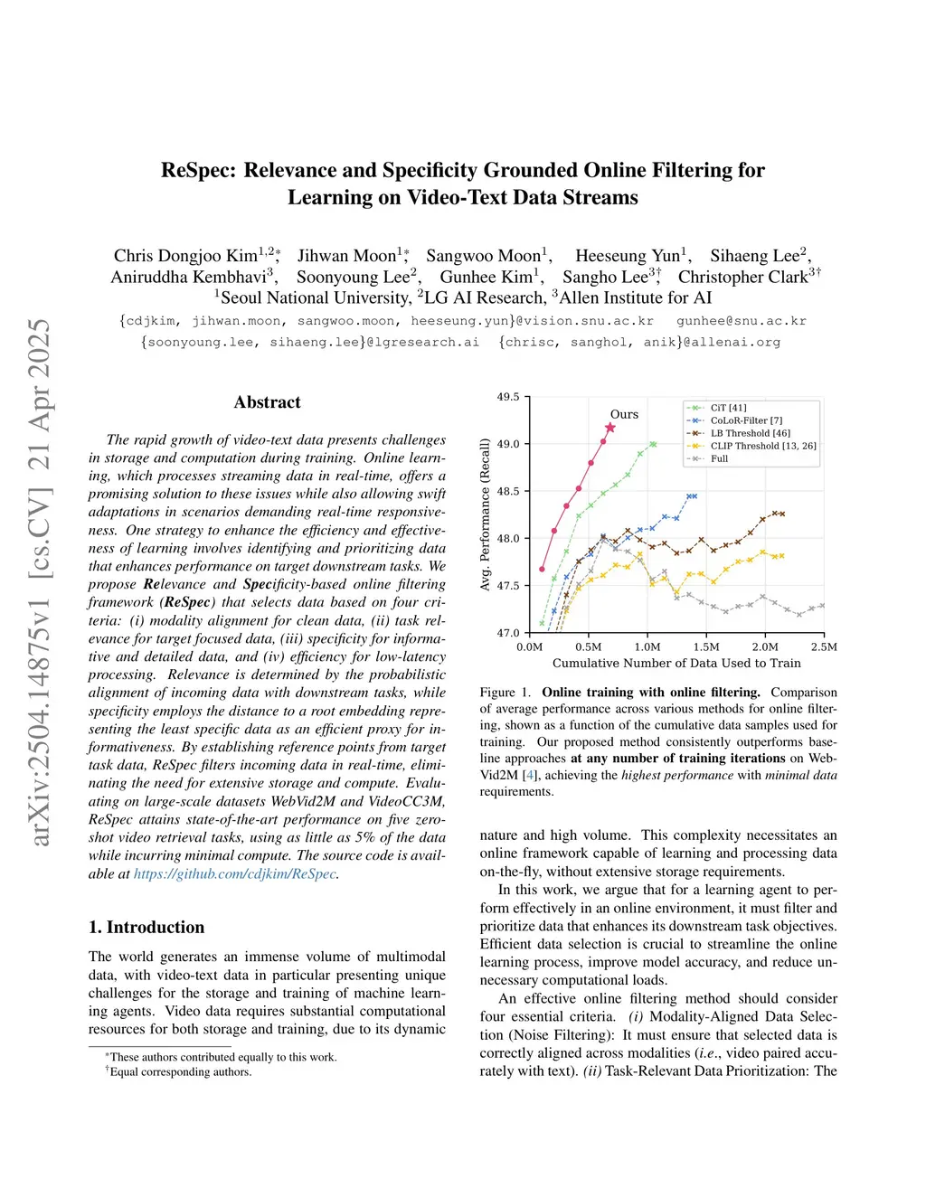 ReSpec: Relevance and Specificity Grounded Online Filtering for Learning on Video-Text Data Streams