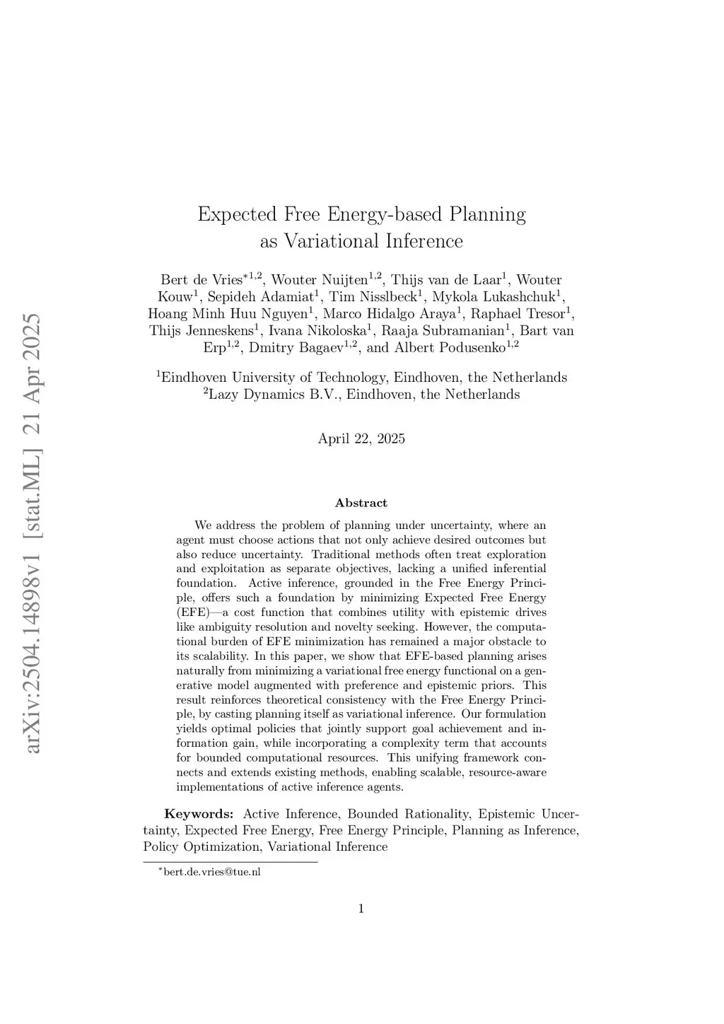 We address the problem of planning under uncertainty, where an agent must choose actions that not only achieve desired outcomes but also reduce uncertainty. Traditional methods often treat exploration and exploitation as separate objectives, lacking a unified inferential foundation. Active inference, grounded in the Free Energy Principle, offers such a foundation by minimizing Expected Free Energy (EFE), a cost function that combines utility with epistemic drives like ambiguity resolution and novelty seeking. However, the computational burden of EFE minimization has remained a major obstacle to its scalability. In this paper, we show that EFE-based planning arises naturally from minimizing a variational free energy functional on a generative model augmented with preference and epistemic priors. This result reinforces theoretical consistency with the Free Energy Principle, by casting planning itself as variational inference. Our formulation yields optimal policies that jointly support goal achievement and information gain, while incorporating a complexity term that accounts for bounded computational resources. This unifying framework connects and extends existing methods, enabling scalable, resource-aware implementations of active inference agents.