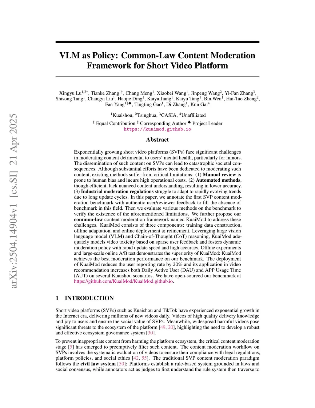 Exponentially growing short video platforms (SVPs) face significant challenges in moderating content detrimental to users' mental health, particularly for minors. The dissemination of such content on SVPs can lead to catastrophic societal consequences. Although substantial efforts have been dedicated to moderating such content, existing methods suffer from critical limitations: (1) Manual review is prone to human bias and incurs high operational costs. (2) Automated methods, though efficient, lack nuanced content understanding, resulting in lower accuracy. (3) Industrial moderation regulations struggle to adapt to rapidly evolving trends due to long update cycles. In this paper, we annotate the first SVP content moderation benchmark with authentic user/reviewer feedback to fill the absence of benchmark in this field. Then we evaluate various methods on the benchmark to verify the existence of the aforementioned limitations. We further propose our common-law content moderation framework named KuaiMod to address these challenges. KuaiMod consists of three components: training data construction, offline adaptation, and online deployment & refinement. Leveraging large vision language model (VLM) and Chain-of-Thought (CoT) reasoning, KuaiMod adequately models video toxicity based on sparse user feedback and fosters dynamic moderation policy with rapid update speed and high accuracy. Offline experiments and large-scale online A/B test demonstrates the superiority of KuaiMod: KuaiMod achieves the best moderation performance on our benchmark. The deployment of KuaiMod reduces the user reporting rate by 20% and its application in video recommendation increases both Daily Active User (DAU) and APP Usage Time (AUT) on several Kuaishou scenarios. We have open-sourced our benchmark atthis https URL.