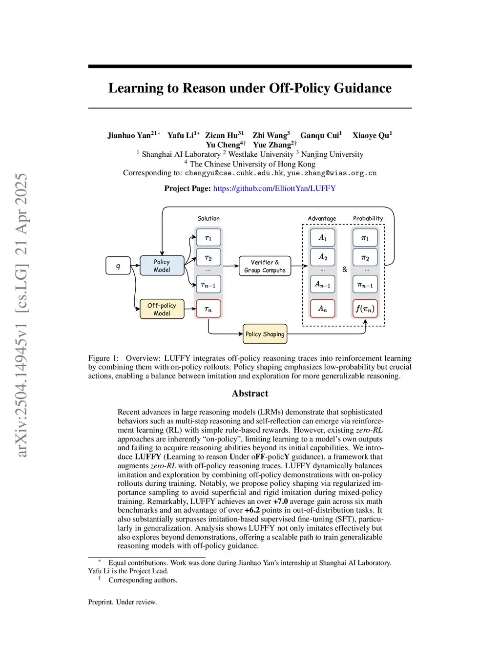 Recent advances in large reasoning models (LRMs) demonstrate that sophisticated behaviors such as multi-step reasoning and self-reflection can emerge via reinforcement learning with verifiable rewards~(\textit{RLVR}). However, existing \textit{RLVR} approaches are inherently ``on-policy'', limiting learning to a model's own outputs and failing to acquire reasoning abilities beyond its initial capabilities. To address this issue, we introduce \textbf{LUFFY} (\textbf{L}earning to reason \textbf{U}nder o\textbf{FF}-polic\textbf{Y} guidance), a framework that augments \textit{RLVR} with off-policy reasoning traces. LUFFY dynamically balances imitation and exploration by combining off-policy demonstrations with on-policy rollouts during training. Specifically, LUFFY combines the Mixed-Policy GRPO framework, which has a theoretically guaranteed convergence rate, alongside policy shaping via regularized importance sampling to avoid superficial and rigid imitation during mixed-policy training. Compared with previous RLVR methods, LUFFY achieves an over \textbf{+6.4} average gain across six math benchmarks and an advantage of over \textbf{+6.2} points in out-of-distribution tasks. Most significantly, we show that LUFFY successfully trains weak models in scenarios where on-policy RLVR completely fails. These results provide compelling evidence that LUFFY transcends the fundamental limitations of on-policy RLVR and demonstrates the great potential of utilizing off-policy guidance in RLVR.