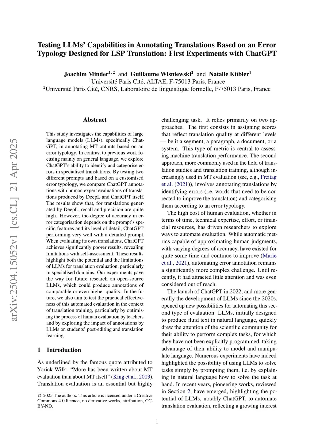 This study investigates the capabilities of large language models (LLMs), specifically ChatGPT, in annotating MT outputs based on an error typology. In contrast to previous work focusing mainly on general language, we explore ChatGPT's ability to identify and categorise errors in specialised translations. By testing two different prompts and based on a customised error typology, we compare ChatGPT annotations with human expert evaluations of translations produced by DeepL and ChatGPT itself. The results show that, for translations generated by DeepL, recall and precision are quite high. However, the degree of accuracy in error categorisation depends on the prompt's specific features and its level of detail, ChatGPT performing very well with a detailed prompt. When evaluating its own translations, ChatGPT achieves significantly poorer results, revealing limitations with self-assessment. These results highlight both the potential and the limitations of LLMs for translation evaluation, particularly in specialised domains. Our experiments pave the way for future research on open-source LLMs, which could produce annotations of comparable or even higher quality. In the future, we also aim to test the practical effectiveness of this automated evaluation in the context of translation training, particularly by optimising the process of human evaluation by teachers and by exploring the impact of annotations by LLMs on students' post-editing and translation learning.