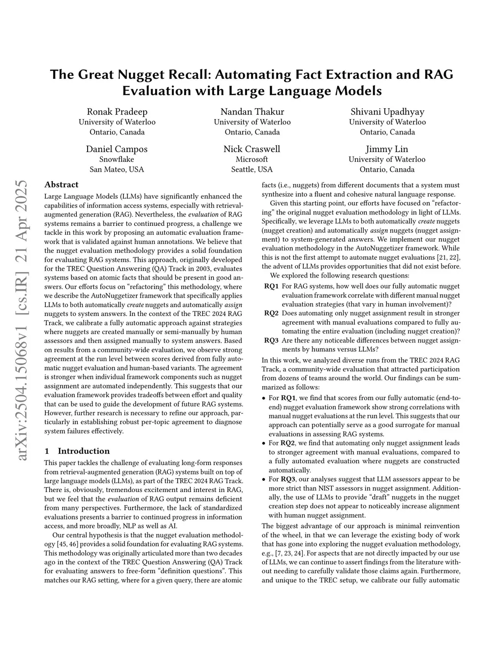 Large Language Models (LLMs) have significantly enhanced the capabilities of information access systems, especially with retrieval-augmented generation (RAG). Nevertheless, the evaluation of RAG systems remains a barrier to continued progress, a challenge we tackle in this work by proposing an automatic evaluation framework that is validated against human annotations. We believe that the nugget evaluation methodology provides a solid foundation for evaluating RAG systems. This approach, originally developed for the TREC Question Answering (QA) Track in 2003, evaluates systems based on atomic facts that should be present in good answers. Our efforts focus on "refactoring" this methodology, where we describe the AutoNuggetizer framework that specifically applies LLMs to both automatically create nuggets and automatically assign nuggets to system answers. In the context of the TREC 2024 RAG Track, we calibrate a fully automatic approach against strategies where nuggets are created manually or semi-manually by human assessors and then assigned manually to system answers. Based on results from a community-wide evaluation, we observe strong agreement at the run level between scores derived from fully automatic nugget evaluation and human-based variants. The agreement is stronger when individual framework components such as nugget assignment are automated independently. This suggests that our evaluation framework provides tradeoffs between effort and quality that can be used to guide the development of future RAG systems. However, further research is necessary to refine our approach, particularly in establishing robust per-topic agreement to diagnose system failures effectively.