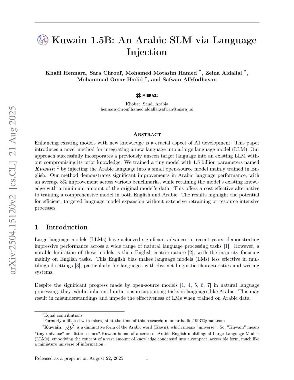 Kuwain 1.5B: An Arabic SLM via Language Injection