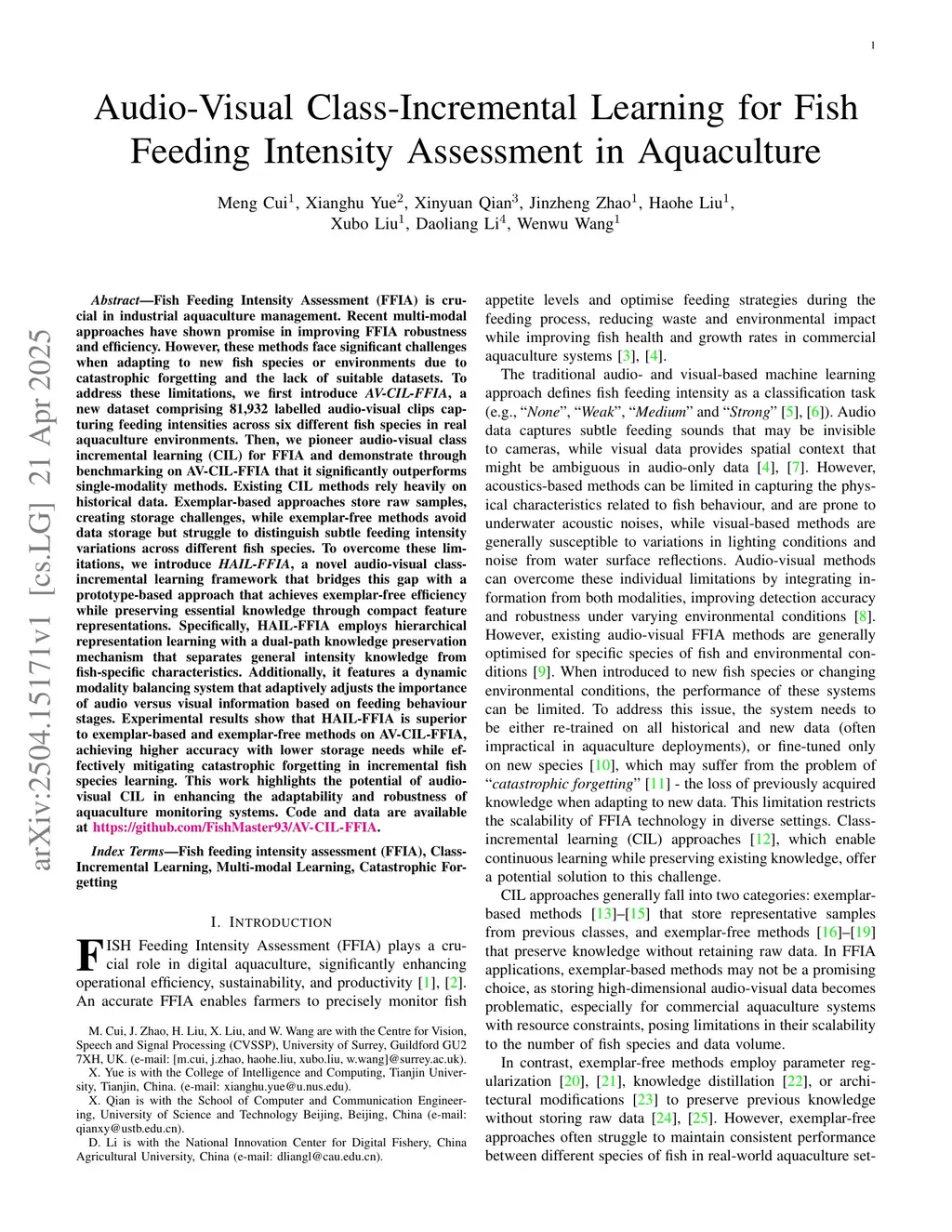 Fish Feeding Intensity Assessment (FFIA) is crucial in industrial aquaculture management. Recent multi-modal approaches have shown promise in improving FFIA robustness and efficiency. However, these methods face significant challenges when adapting to new fish species or environments due to catastrophic forgetting and the lack of suitable datasets. To address these limitations, we first introduce AV-CIL-FFIA, a new dataset comprising 81,932 labelled audio-visual clips capturing feeding intensities across six different fish species in real aquaculture environments. Then, we pioneer audio-visual class incremental learning (CIL) for FFIA and demonstrate through benchmarking on AV-CIL-FFIA that it significantly outperforms single-modality methods. Existing CIL methods rely heavily on historical data. Exemplar-based approaches store raw samples, creating storage challenges, while exemplar-free methods avoid data storage but struggle to distinguish subtle feeding intensity variations across different fish species. To overcome these limitations, we introduce HAIL-FFIA, a novel audio-visual class-incremental learning framework that bridges this gap with a prototype-based approach that achieves exemplar-free efficiency while preserving essential knowledge through compact feature representations. Specifically, HAIL-FFIA employs hierarchical representation learning with a dual-path knowledge preservation mechanism that separates general intensity knowledge from fish-specific characteristics. Additionally, it features a dynamic modality balancing system that adaptively adjusts the importance of audio versus visual information based on feeding behaviour stages. Experimental results show that HAIL-FFIA is superior to SOTA methods on AV-CIL-FFIA, achieving higher accuracy with lower storage needs while effectively mitigating catastrophic forgetting in incremental fish species learning.