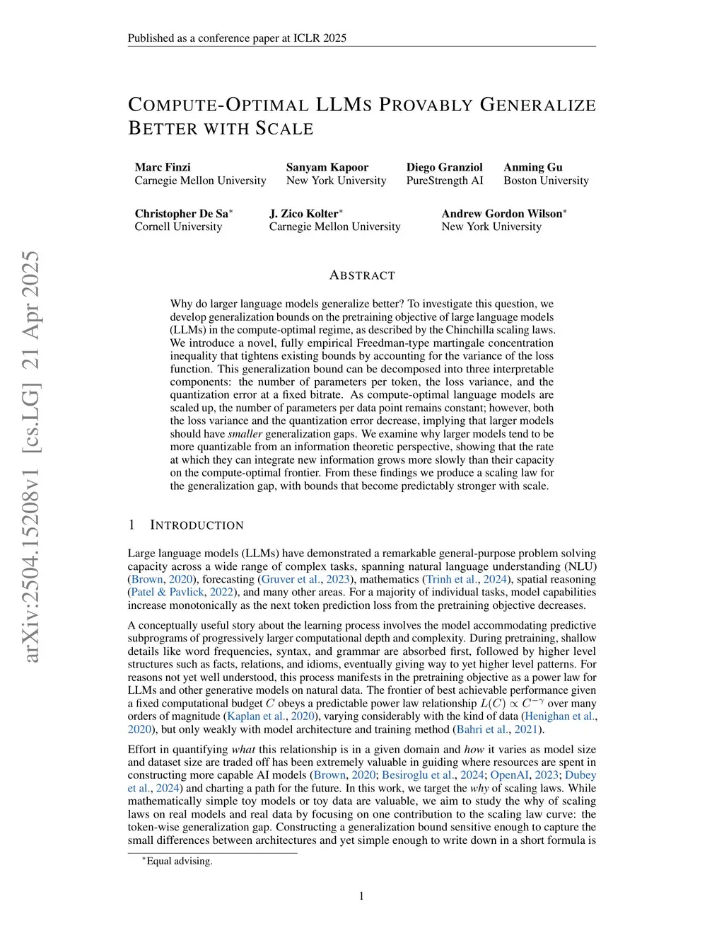 Why do larger language models generalize better? To investigate this question, we develop generalization bounds on the pretraining objective of large language models (LLMs) in the compute-optimal regime, as described by the Chinchilla scaling laws. We introduce a novel, fully empirical Freedman-type martingale concentration inequality that tightens existing bounds by accounting for the variance of the loss function. This generalization bound can be decomposed into three interpretable components: the number of parameters per token, the loss variance, and the quantization error at a fixed bitrate. As compute-optimal language models are scaled up, the number of parameters per data point remains constant; however, both the loss variance and the quantization error decrease, implying that larger models should have smaller generalization gaps. We examine why larger models tend to be more quantizable from an information theoretic perspective, showing that the rate at which they can integrate new information grows more slowly than their capacity on the compute-optimal frontier. From these findings we produce a scaling law for the generalization gap, with bounds that become predictably stronger with scale.