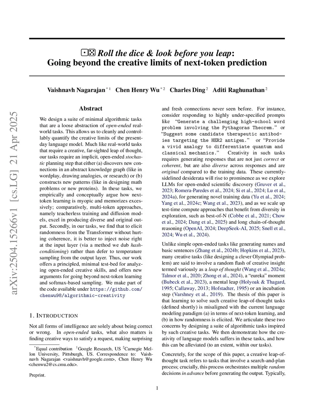 Roll the dice & look before you leap: Going beyond the creative limits of next-token prediction