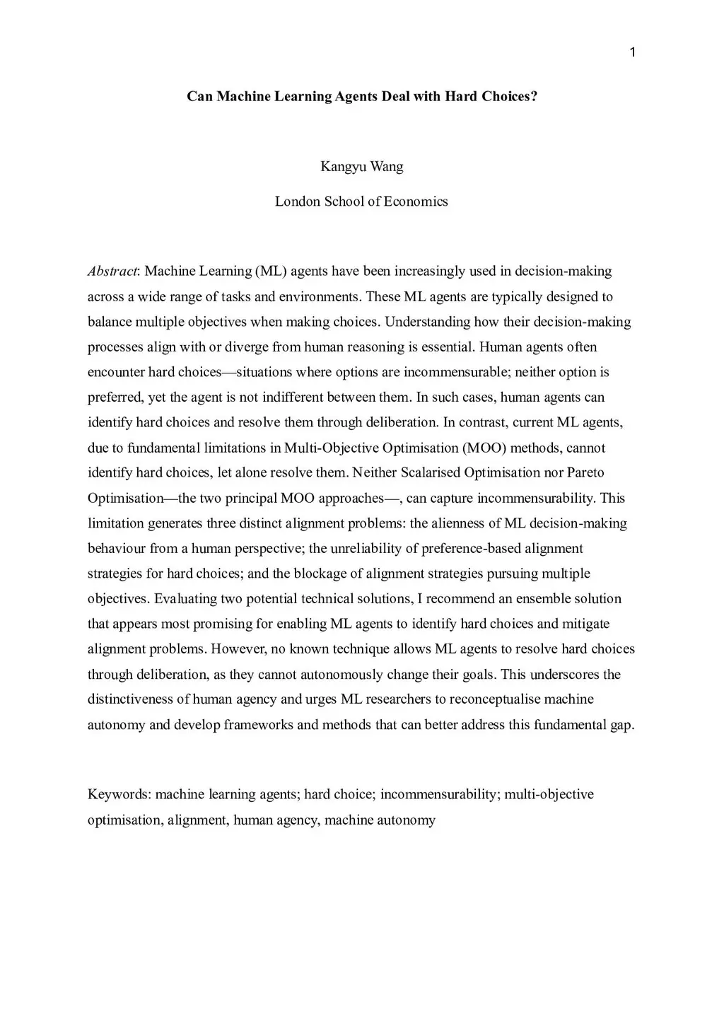 Machine Learning ML agents have been increasingly used in decision-making across a wide range of tasks and environments. These ML agents are typically designed to balance multiple objectives when making choices. Understanding how their decision-making processes align with or diverge from human reasoning is essential. Human agents often encounter hard choices, that is, situations where options are incommensurable; neither option is preferred, yet the agent is not indifferent between them. In such cases, human agents can identify hard choices and resolve them through deliberation. In contrast, current ML agents, due to fundamental limitations in Multi-Objective Optimisation or MOO methods, cannot identify hard choices, let alone resolve them. Neither Scalarised Optimisation nor Pareto Optimisation, the two principal MOO approaches, can capture incommensurability. This limitation generates three distinct alignment problems: the alienness of ML decision-making behaviour from a human perspective; the unreliability of preference-based alignment strategies for hard choices; and the blockage of alignment strategies pursuing multiple objectives. Evaluating two potential technical solutions, I recommend an ensemble solution that appears most promising for enabling ML agents to identify hard choices and mitigate alignment problems. However, no known technique allows ML agents to resolve hard choices through deliberation, as they cannot autonomously change their goals. This underscores the distinctiveness of human agency and urges ML researchers to reconceptualise machine autonomy and develop frameworks and methods that can better address this fundamental gap.