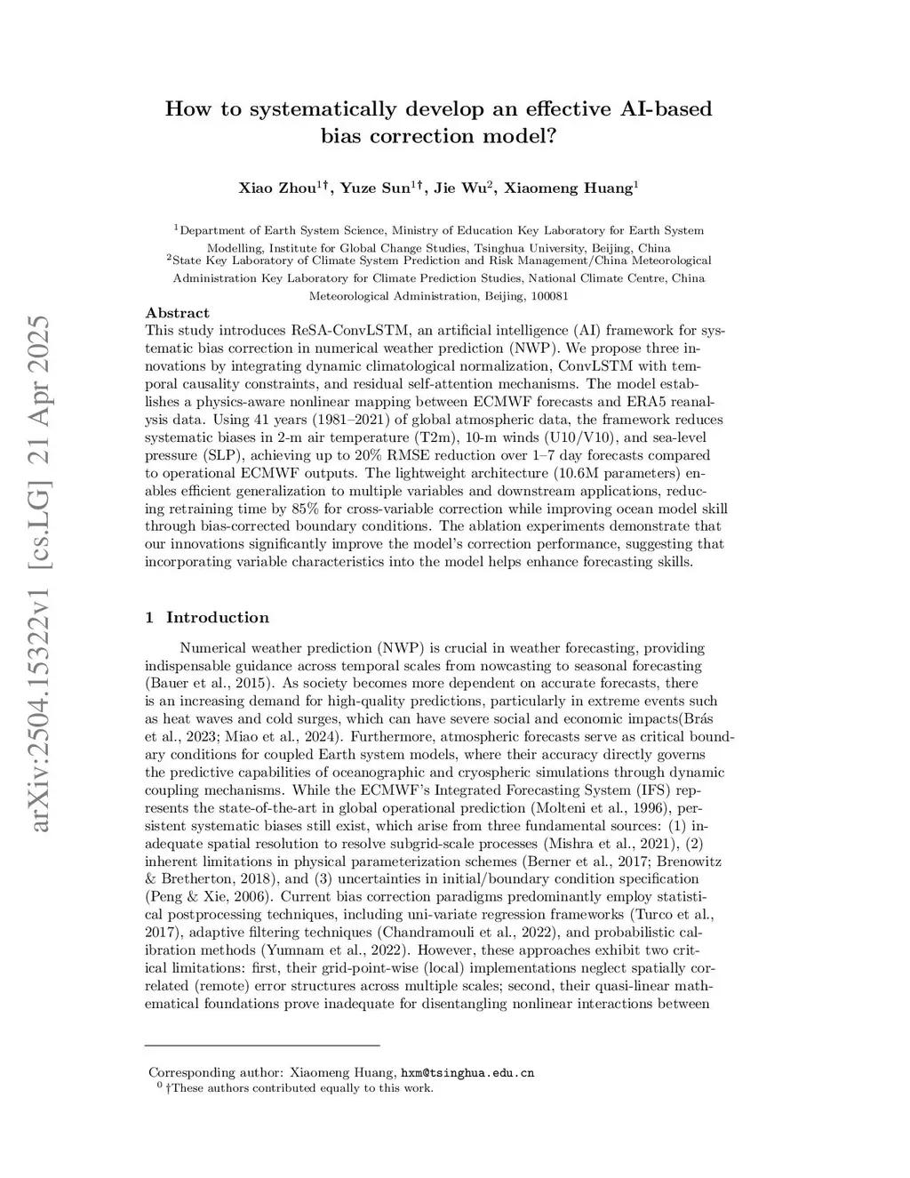 This study introduces ReSA-ConvLSTM, an artificial intelligence (AI) framework for systematic bias correction in numerical weather prediction (NWP). We propose three innovations by integrating dynamic climatological normalization, ConvLSTM with temporal causality constraints, and residual self-attention mechanisms. The model establishes a physics-aware nonlinear mapping between ECMWF forecasts and ERA5 reanalysis data. Using 41 years (1981-2021) of global atmospheric data, the framework reduces systematic biases in 2-m air temperature (T2m), 10-m winds (U10/V10), and sea-level pressure (SLP), achieving up to 20% RMSE reduction over 1-7 day forecasts compared to operational ECMWF outputs. The lightweight architecture (10.6M parameters) enables efficient generalization to multiple variables and downstream applications, reducing retraining time by 85% for cross-variable correction while improving ocean model skill through bias-corrected boundary conditions. The ablation experiments demonstrate that our innovations significantly improve the model's correction performance, suggesting that incorporating variable characteristics into the model helps enhance forecasting skills.