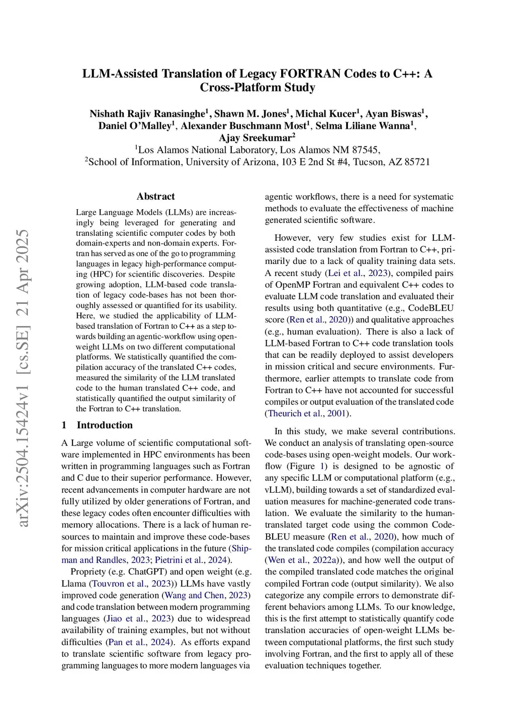 Large Language Models (LLMs) are increasingly being leveraged for generating and translating scientific computer codes by both domain-experts and non-domain experts. Fortran has served as one of the go to programming languages in legacy high-performance computing (HPC) for scientific discoveries. Despite growing adoption, LLM-based code translation of legacy code-bases has not been thoroughly assessed or quantified for its usability. Here, we studied the applicability of LLM-based translation of Fortran to C++ as a step towards building an agentic-workflow using open-weight LLMs on two different computational platforms. We statistically quantified the compilation accuracy of the translated C++ codes, measured the similarity of the LLM translated code to the human translated C++ code, and statistically quantified the output similarity of the Fortran to C++ translation.