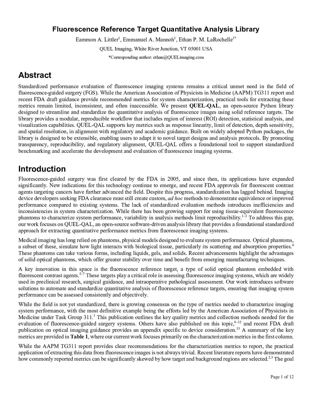 Standardized performance evaluation of fluorescence imaging systems remains a critical unmet need in the field of fluorescence-guided surgery (FGS). While the American Association of Physicists in Medicine (AAPM) TG311 report and recent FDA draft guidance provide recommended metrics for system characterization, practical tools for extracting these metrics remain limited, inconsistent, and often inaccessible. We present QUEL-QAL, an open-source Python library designed to streamline and standardize the quantitative analysis of fluorescence images using solid reference targets. The library provides a modular, reproducible workflow that includes region of interest (ROI) detection, statistical analysis, and visualization capabilities. QUEL-QAL supports key metrics such as response linearity, limit of detection, depth sensitivity, and spatial resolution, in alignment with regulatory and academic guidance. Built on widely adopted Python packages, the library is designed to be extensible, enabling users to adapt it to novel target designs and analysis protocols. By promoting transparency, reproducibility, and regulatory alignment, QUEL-QAL offers a foundational tool to support standardized benchmarking and accelerate the development and evaluation of fluorescence imaging systems.