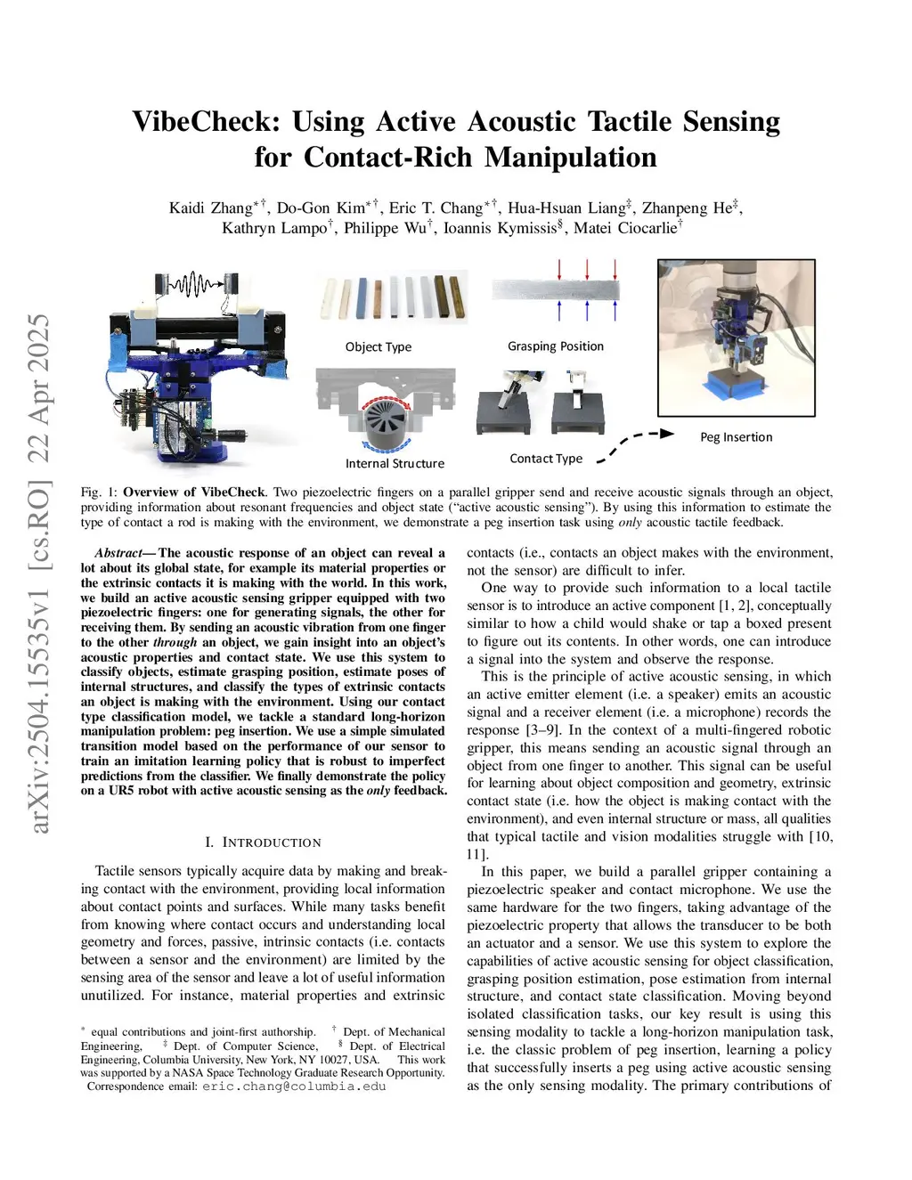 The acoustic response of an object can reveal a lot about its global state, for example its material properties or the extrinsic contacts it is making with the world. In this work, we build an active acoustic sensing gripper equipped with two piezoelectric fingers: one for generating signals, the other for receiving them. By sending an acoustic vibration from one finger to the other through an object, we gain insight into an object's acoustic properties and contact state. We use this system to classify objects, estimate grasping position, estimate poses of internal structures, and classify the types of extrinsic contacts an object is making with the environment. Using our contact type classification model, we tackle a standard long-horizon manipulation problem: peg insertion. We use a simple simulated transition model based on the performance of our sensor to train an imitation learning policy that is robust to imperfect predictions from the classifier. We finally demonstrate the policy on a UR5 robot with active acoustic sensing as the only feedback.