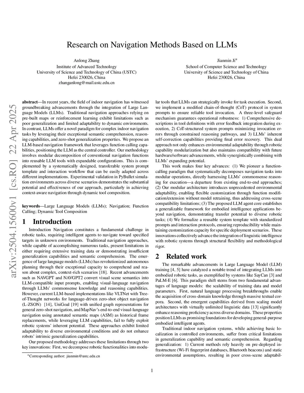 In recent years, the field of indoor navigation has witnessed groundbreaking advancements through the integration of Large Language Models (LLMs). Traditional navigation approaches relying on pre-built maps or reinforcement learning exhibit limitations such as poor generalization and limited adaptability to dynamic environments. In contrast, LLMs offer a novel paradigm for complex indoor navigation tasks by leveraging their exceptional semantic comprehension, reasoning capabilities, and zero-shot generalization properties. We propose an LLM-based navigation framework that leverages function calling capabilities, positioning the LLM as the central controller. Our methodology involves modular decomposition of conventional navigation functions into reusable LLM tools with expandable configurations. This is complemented by a systematically designed, transferable system prompt template and interaction workflow that can be easily adapted across different implementations. Experimental validation in PyBullet simulation environments across diverse scenarios demonstrates the substantial potential and effectiveness of our approach, particularly in achieving context-aware navigation through dynamic tool composition.