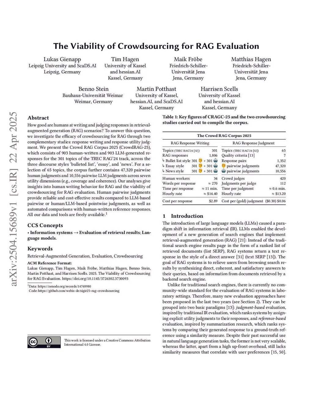 How good are humans at writing and judging responses in retrieval-augmented generation (RAG) scenarios? To answer this question, we investigate the efficacy of crowdsourcing for RAG through two complementary studies: response writing and response utility judgment. We present the Crowd RAG Corpus 2025 (CrowdRAG-25), which consists of 903 human-written and 903 LLM-generated responses for the 301 topics of the TREC RAG'24 track, across the three discourse styles 'bulleted list', éssay', and ñews'. For a selection of 65 topics, the corpus further contains 47,320 pairwise human judgments and 10,556 pairwise LLM judgments across seven utility dimensions (e.g., coverage and coherence). Our analyses give insights into human writing behavior for RAG and the viability of crowdsourcing for RAG evaluation. Human pairwise judgments provide reliable and cost-effective results compared to LLM-based pairwise or human/LLM-based pointwise judgments, as well as automated comparisons with human-written reference responses. All our data and tools are freely available.