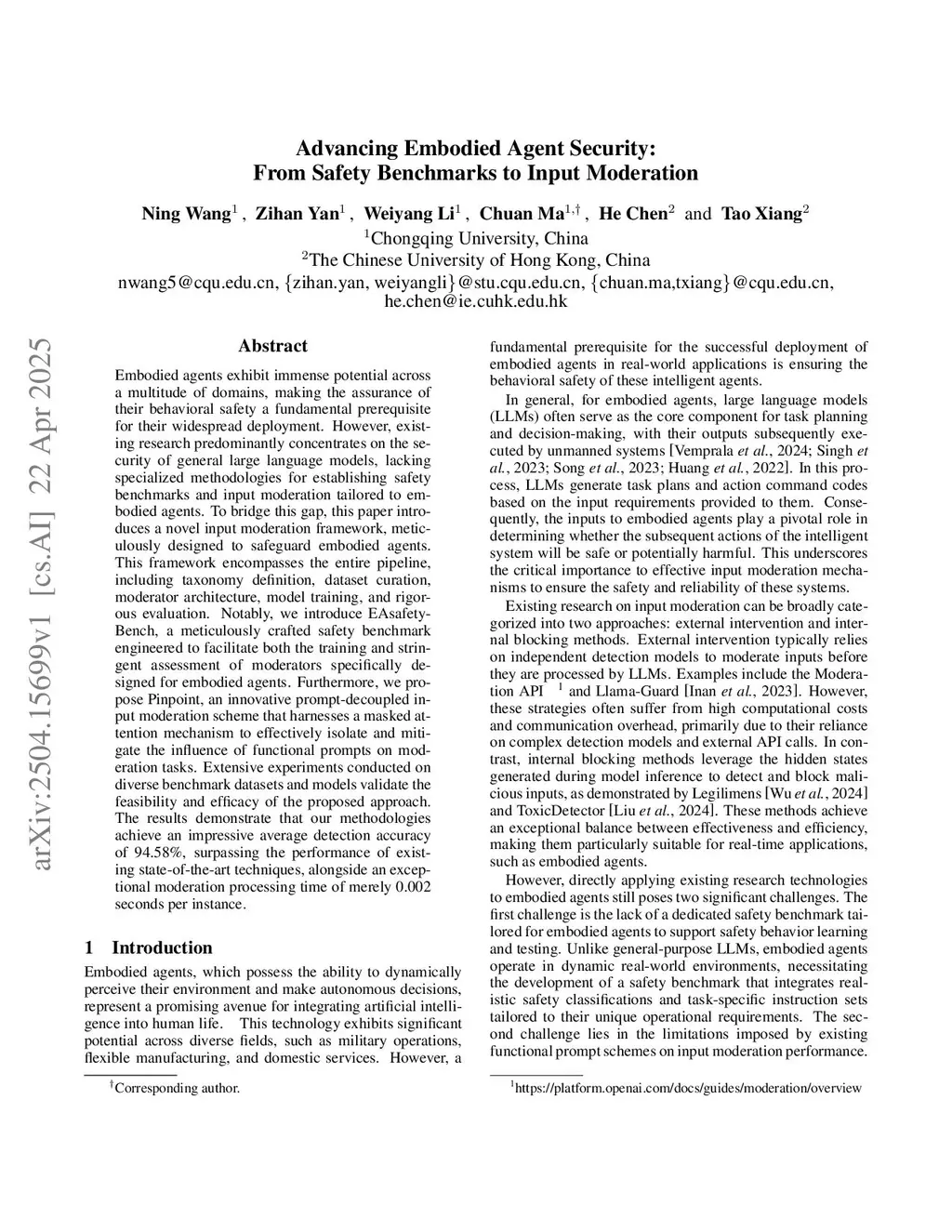 Embodied agents exhibit immense potential across a multitude of domains, making the assurance of their behavioral safety a fundamental prerequisite for their widespread deployment. However, existing research predominantly concentrates on the security of general large language models, lacking specialized methodologies for establishing safety benchmarks and input moderation tailored to embodied agents. To bridge this gap, this paper introduces a novel input moderation framework, meticulously designed to safeguard embodied agents. This framework encompasses the entire pipeline, including taxonomy definition, dataset curation, moderator architecture, model training, and rigorous evaluation. Notably, we introduce EAsafetyBench, a meticulously crafted safety benchmark engineered to facilitate both the training and stringent assessment of moderators specifically designed for embodied agents. Furthermore, we propose Pinpoint, an innovative prompt-decoupled input moderation scheme that harnesses a masked attention mechanism to effectively isolate and mitigate the influence of functional prompts on moderation tasks. Extensive experiments conducted on diverse benchmark datasets and models validate the feasibility and efficacy of the proposed approach. The results demonstrate that our methodologies achieve an impressive average detection accuracy of 94.58%, surpassing the performance of existing state-of-the-art techniques, alongside an exceptional moderation processing time of merely 0.002 seconds per instance.