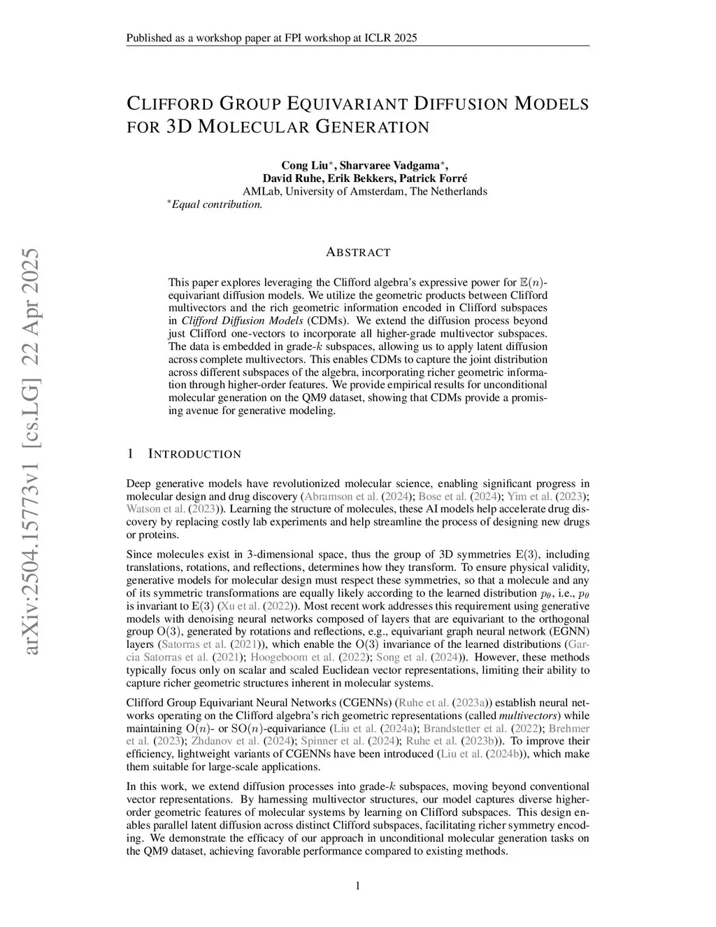This paper explores leveraging the Clifford algebra's expressive power for -equivariant diffusion models. We utilize the geometric products between Clifford multivectors and the rich geometric information encoded in Clifford subspaces in \emph{Clifford Diffusion Models} (CDMs). We extend the diffusion process beyond just Clifford one-vectors to incorporate all higher-grade multivector subspaces. The data is embedded in grade- subspaces, allowing us to apply latent diffusion across complete multivectors. This enables CDMs to capture the joint distribution across different subspaces of the algebra, incorporating richer geometric information through higher-order features. We provide empirical results for unconditional molecular generation on the QM9 dataset, showing that CDMs provide a promising avenue for generative modeling.