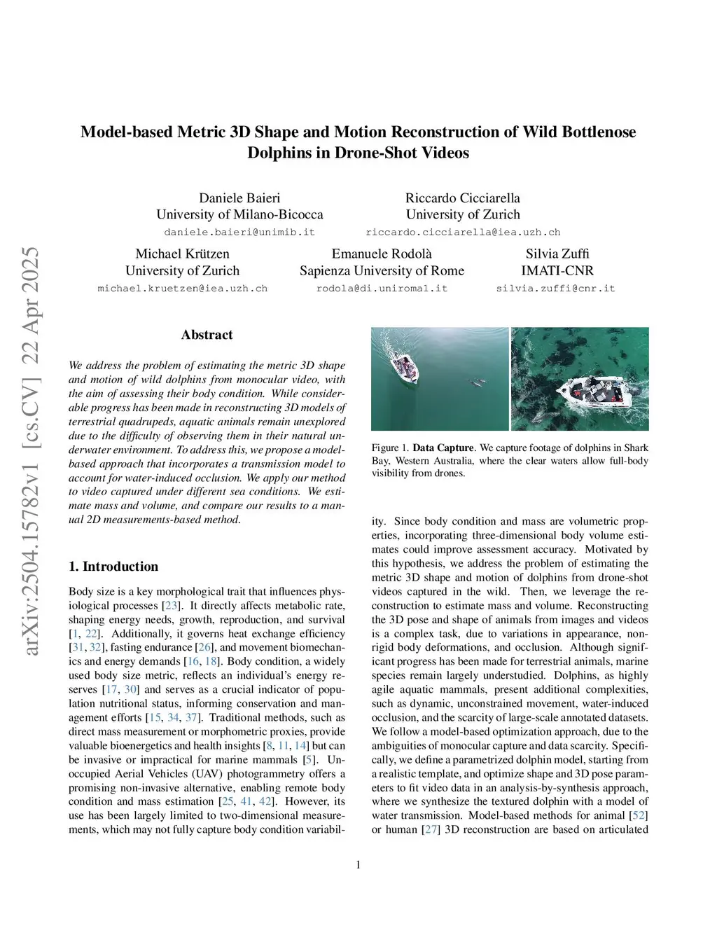 We address the problem of estimating the metric 3D shape and motion of wild dolphins from monocular video, with the aim of assessing their body condition. While considerable progress has been made in reconstructing 3D models of terrestrial quadrupeds, aquatic animals remain unexplored due to the difficulty of observing them in their natural underwater environment. To address this, we propose a model-based approach that incorporates a transmission model to account for water-induced occlusion. We apply our method to video captured under different sea conditions. We estimate mass and volume, and compare our results to a manual 2D measurements-based method. Additionally, we apply our method to video of captive animals with known ground truth mass. While in our experiments the manual approach is often more accurate, our method demonstrates a distinct advantage when applied to larger specimen. These findings highlight the potential of our method as a scalable and automated alternative for mass and volume estimation of dolphins from monocular video.